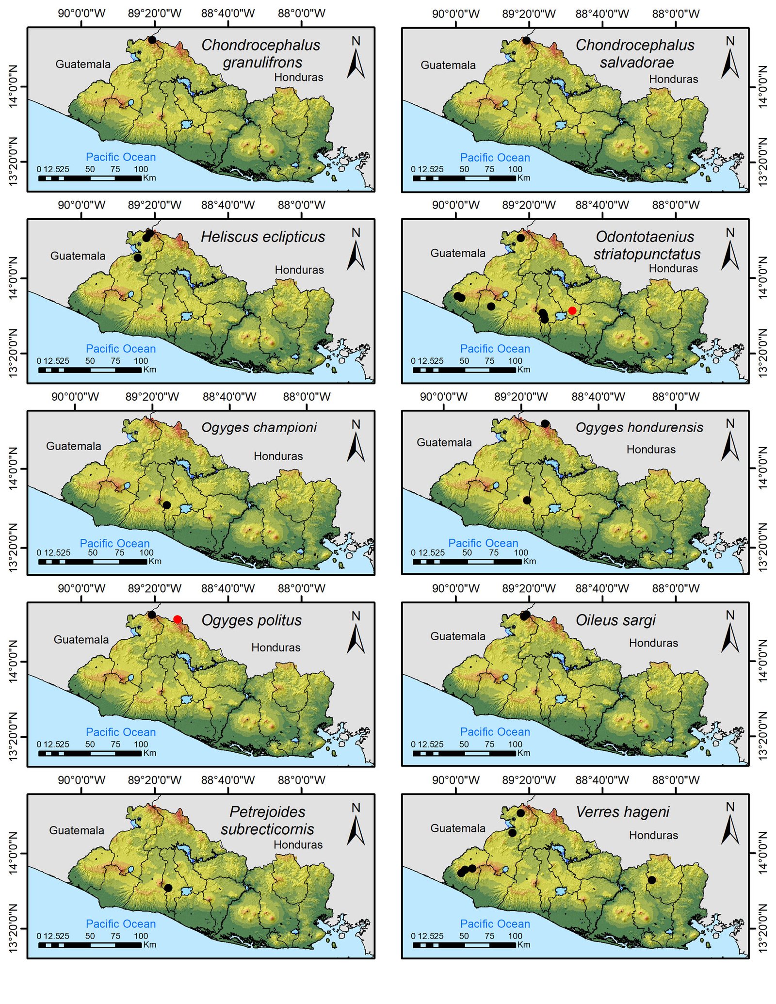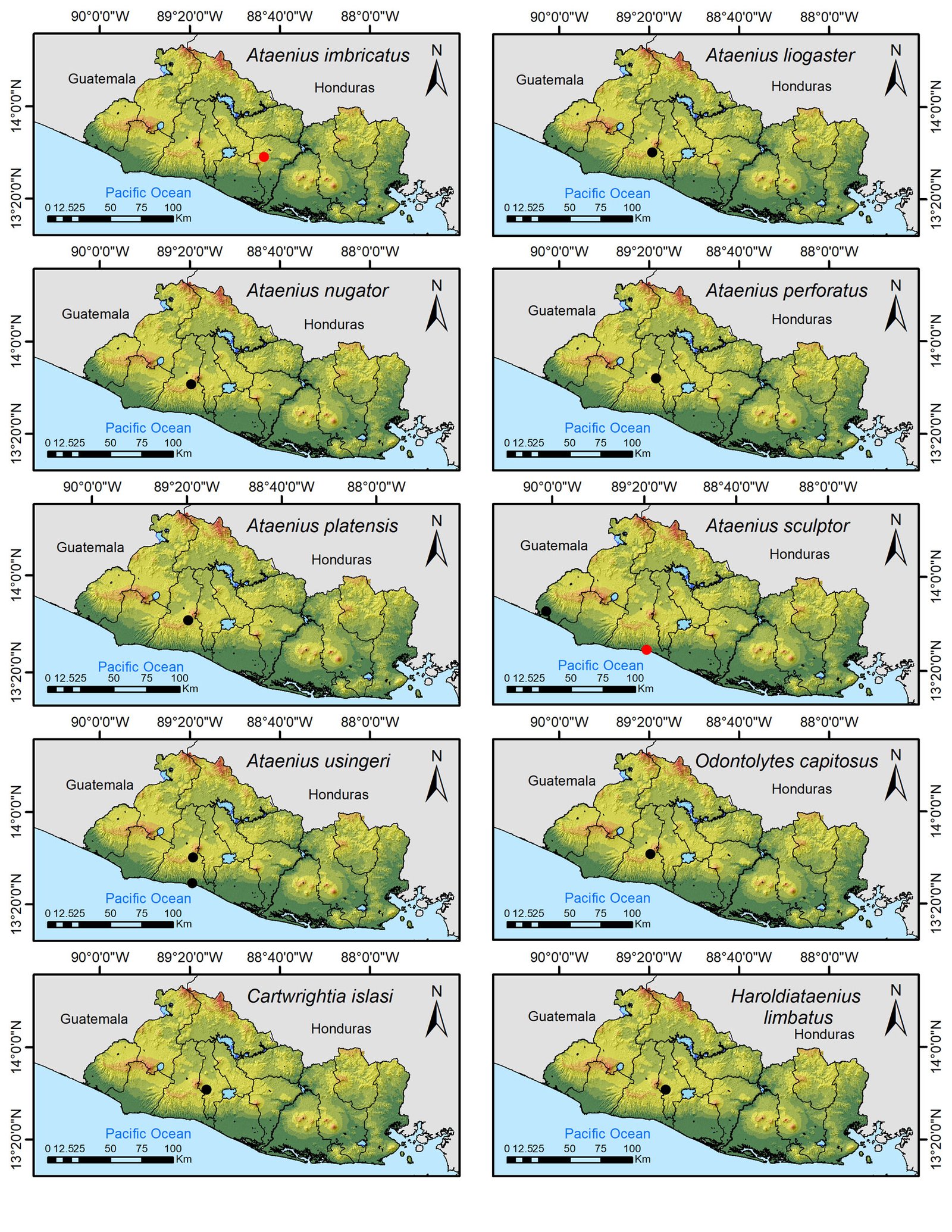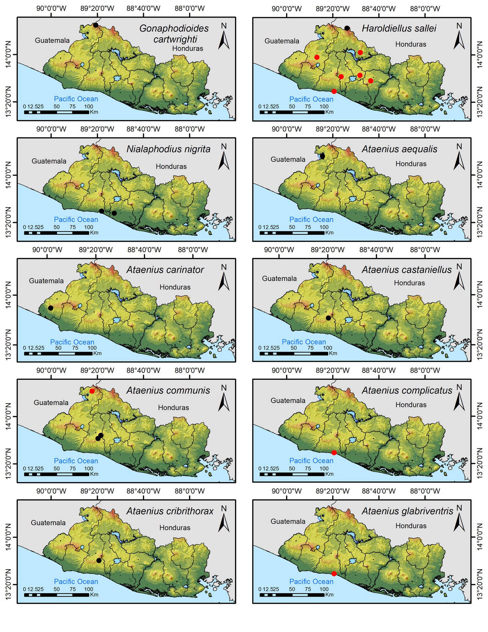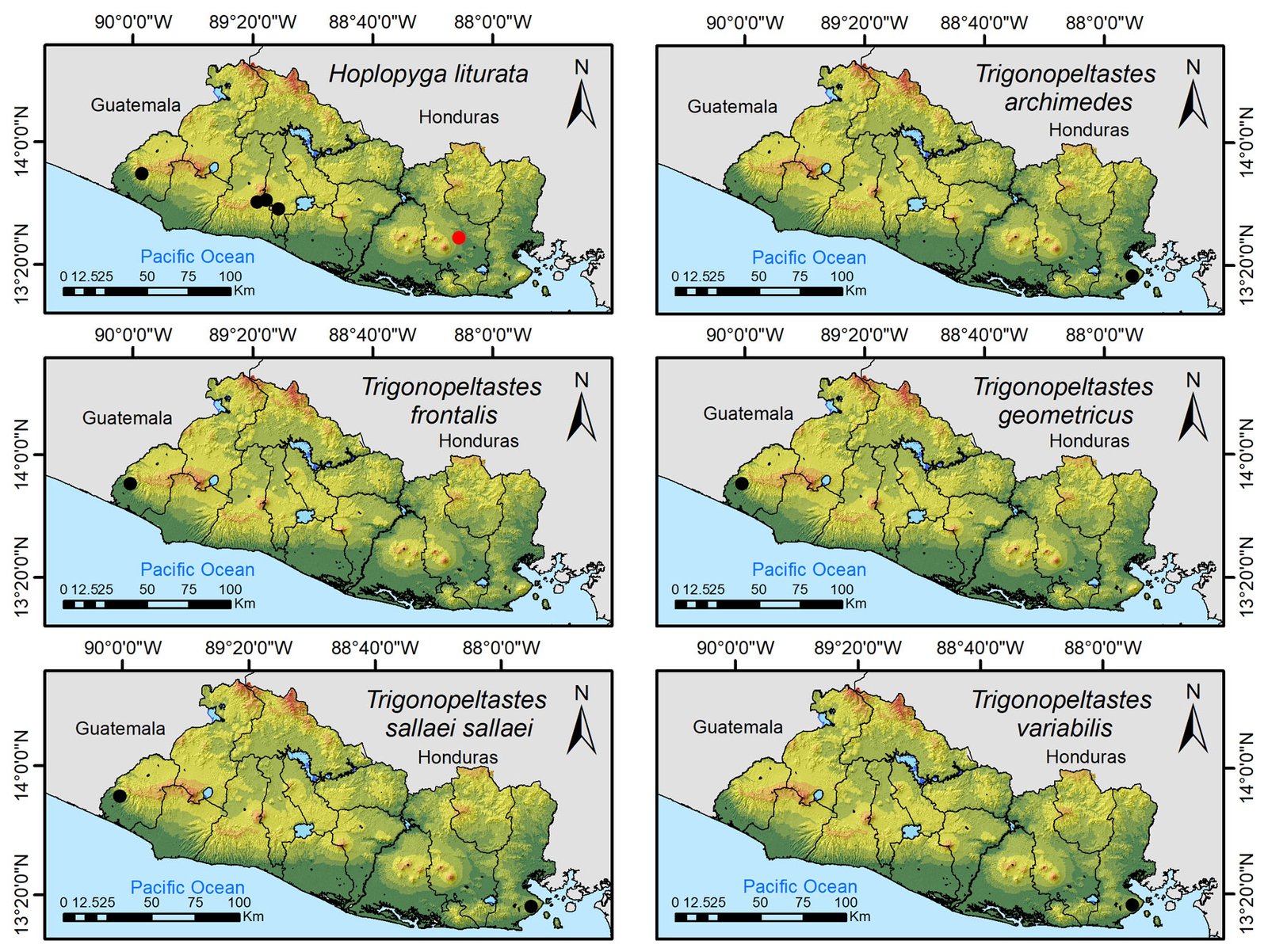 A topographic map of El Salvador (Fig. 1) was used for displaying the distribution of each species with specific locality data in El Salvador. Twenty-one species have no specific locality data. The maps are presented in the same order the species are listed in the catalog. In the case of specimens with a department record only, the departmental capital’s coordinates were used for representation in the map (red points in maps).