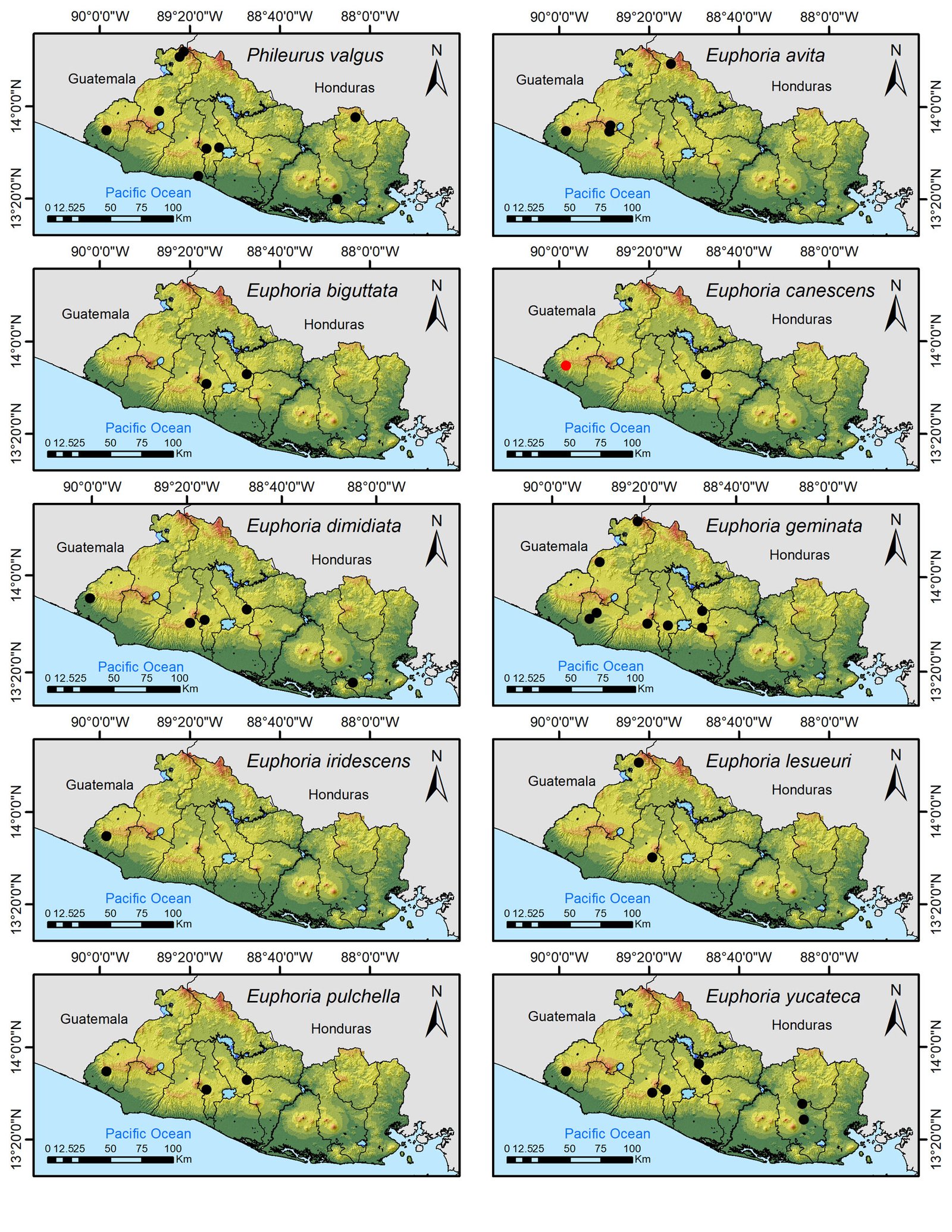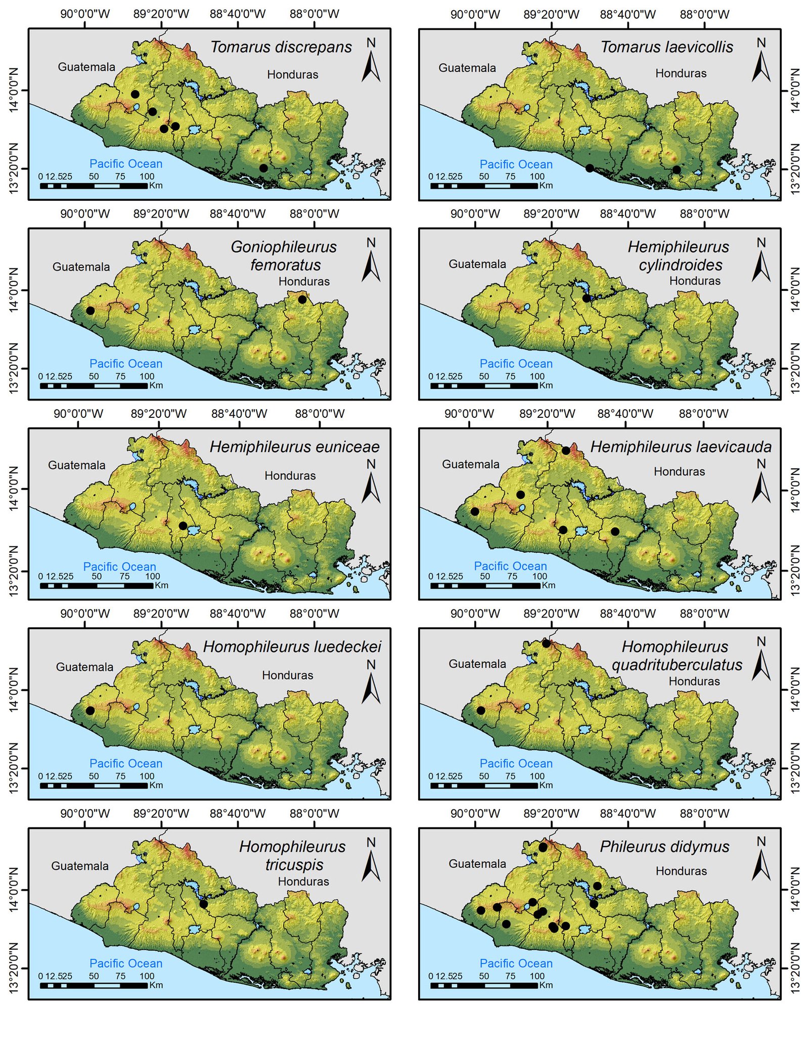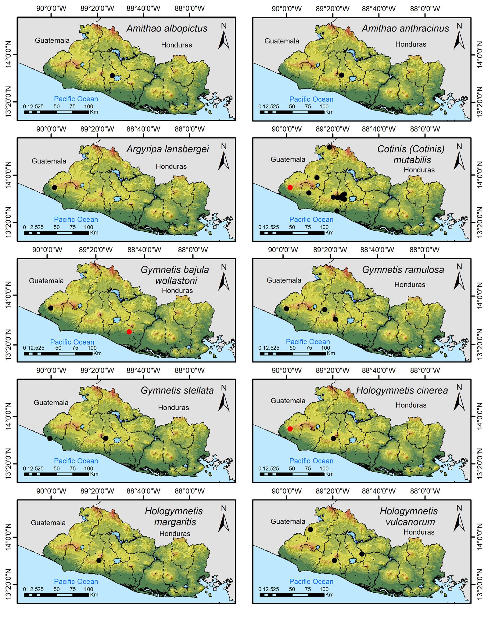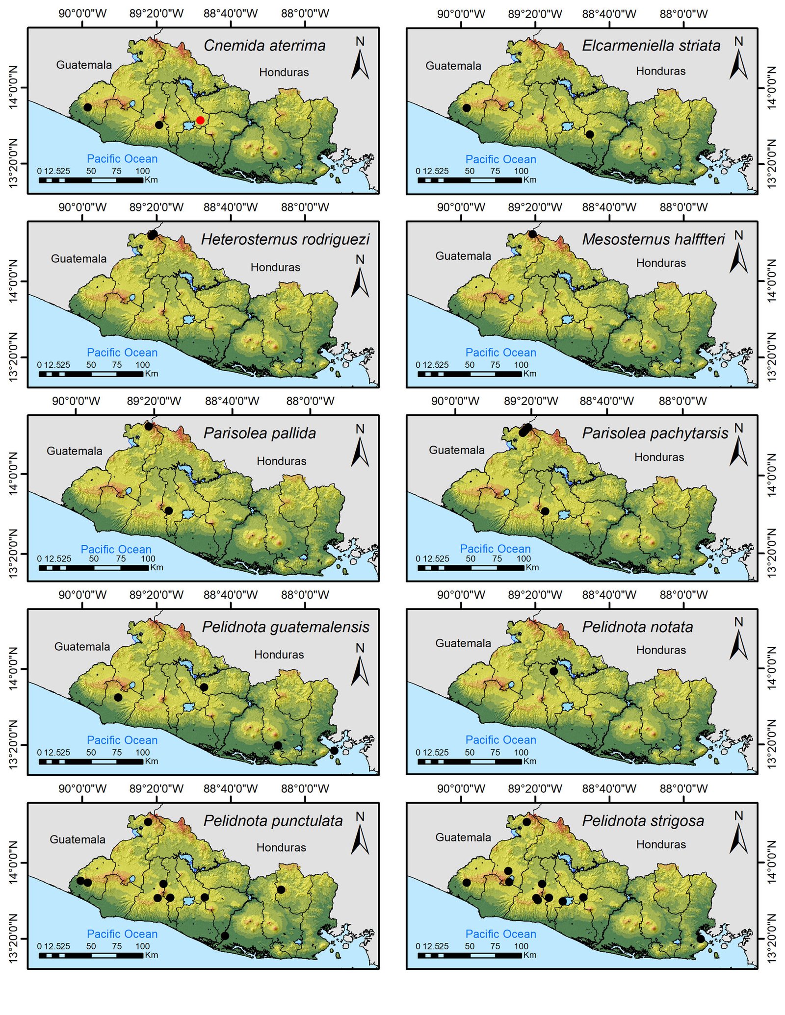 A topographic map of El Salvador (Fig. 1) was used for displaying the distribution of each species with specific locality data in El Salvador. Twenty-one species have no specific locality data. The maps are presented in the same order the species are listed in the catalog. In the case of specimens with a department record only, the departmental capital’s coordinates were used for representation in the map (red points in maps).