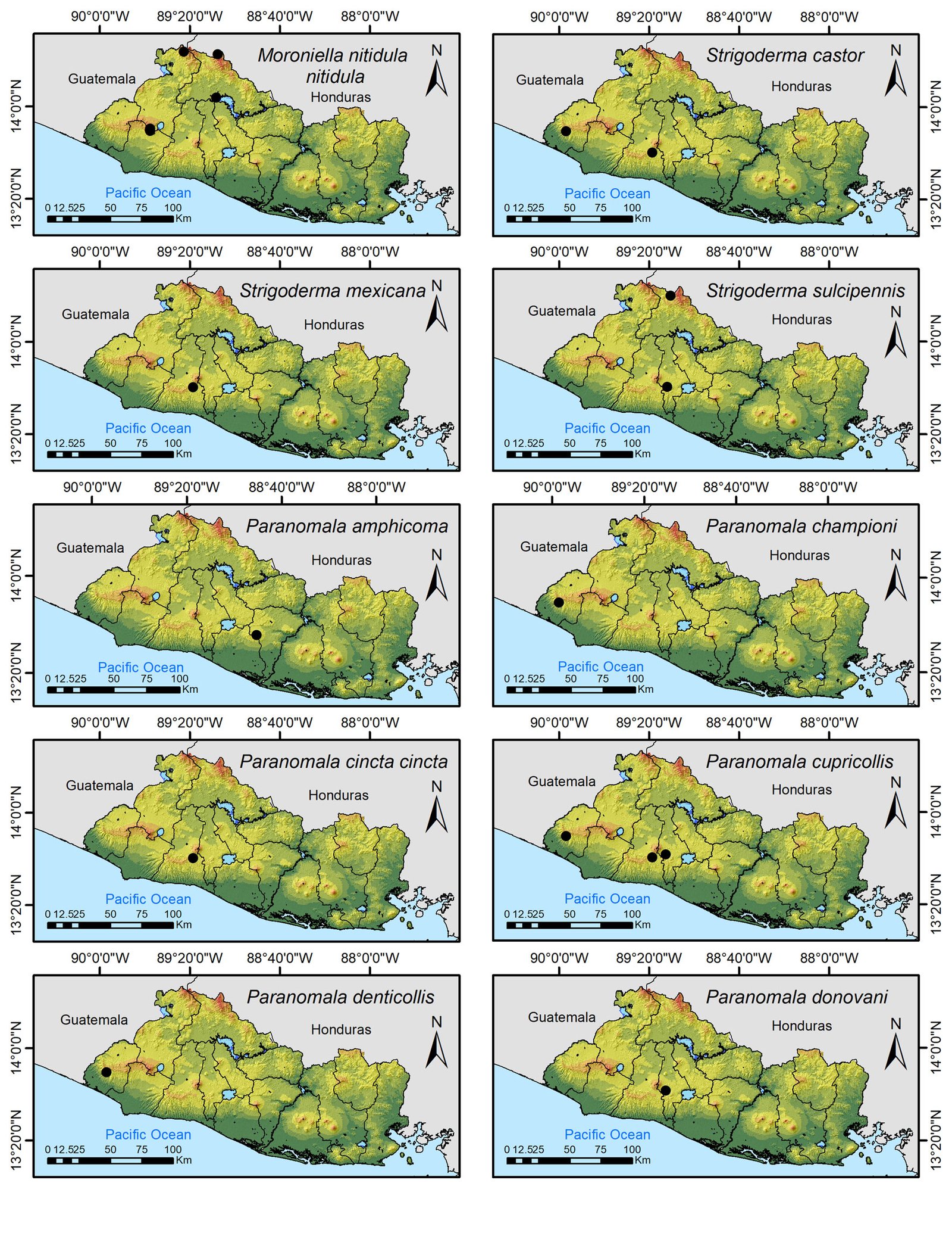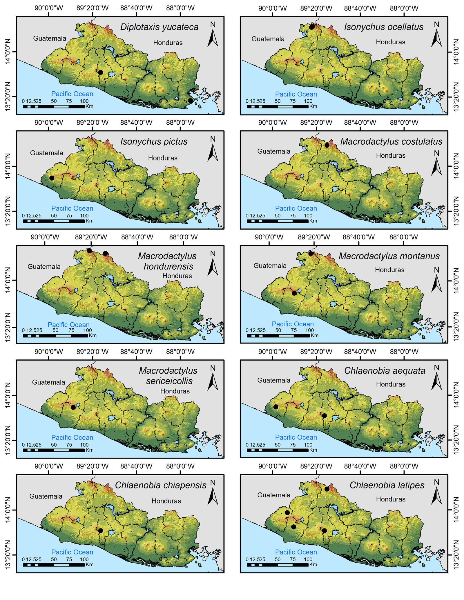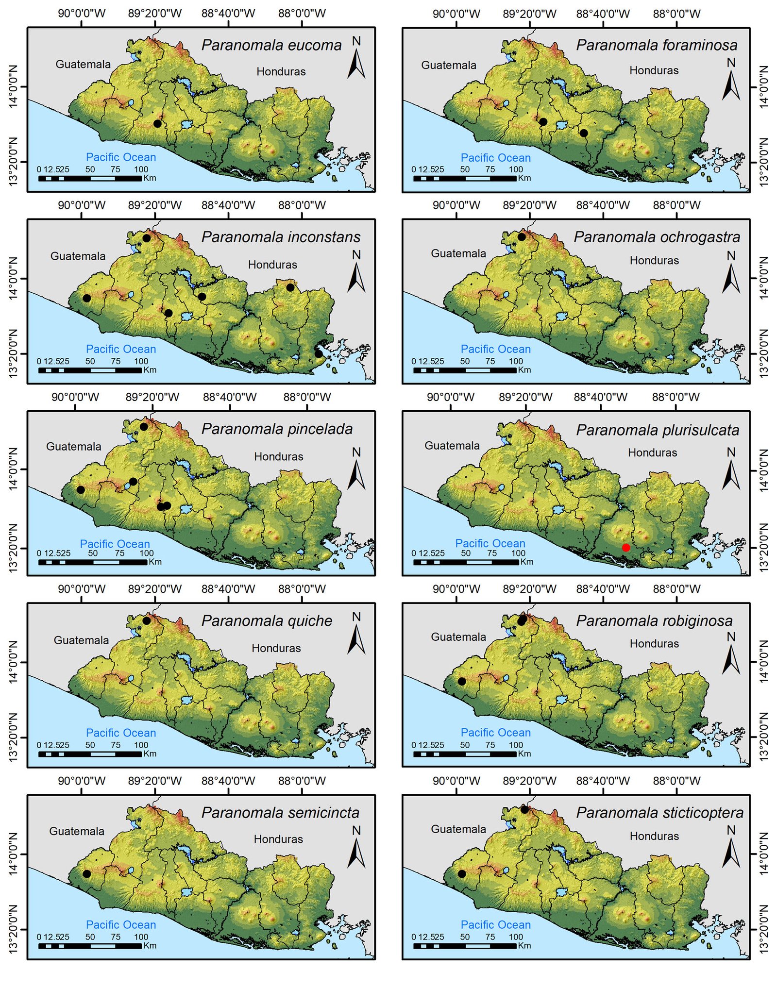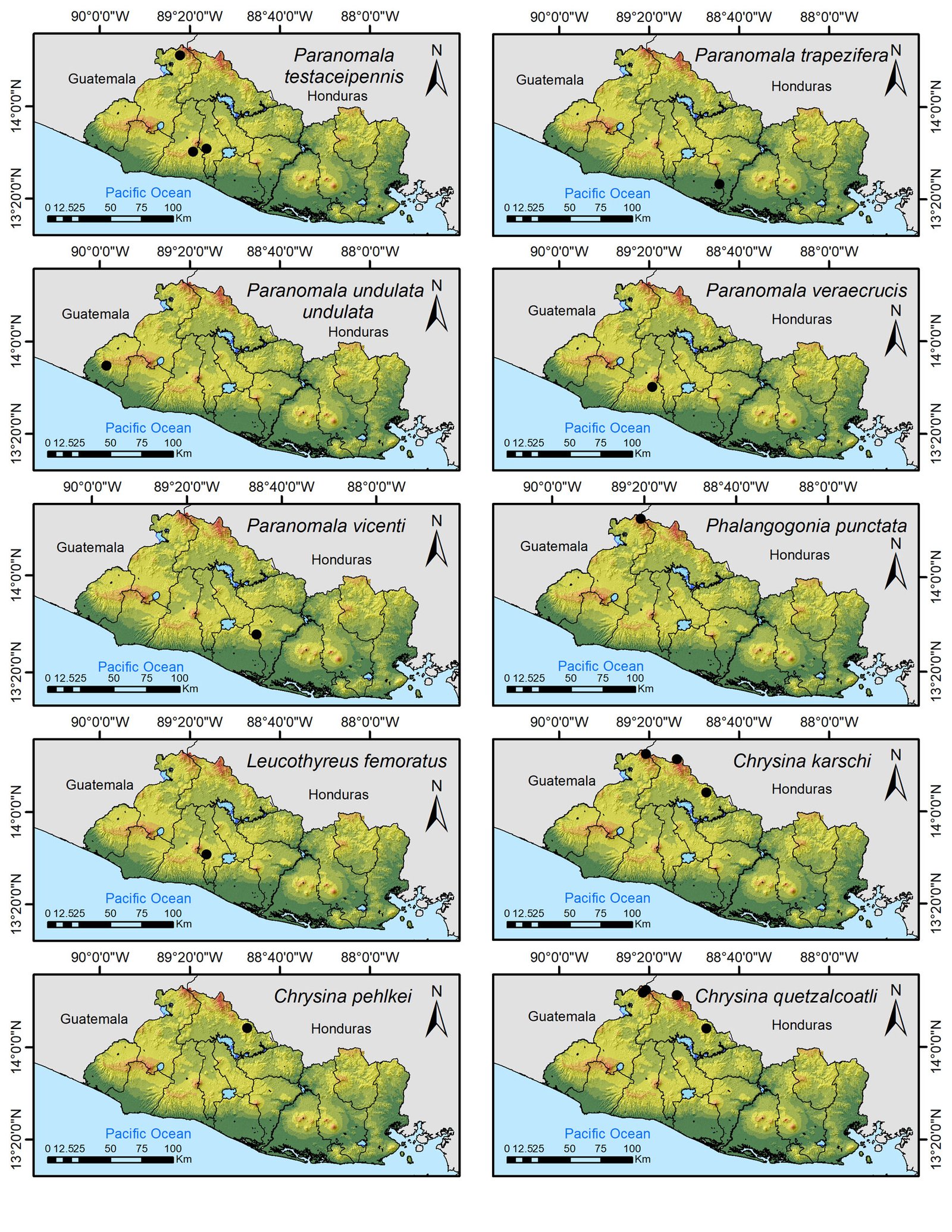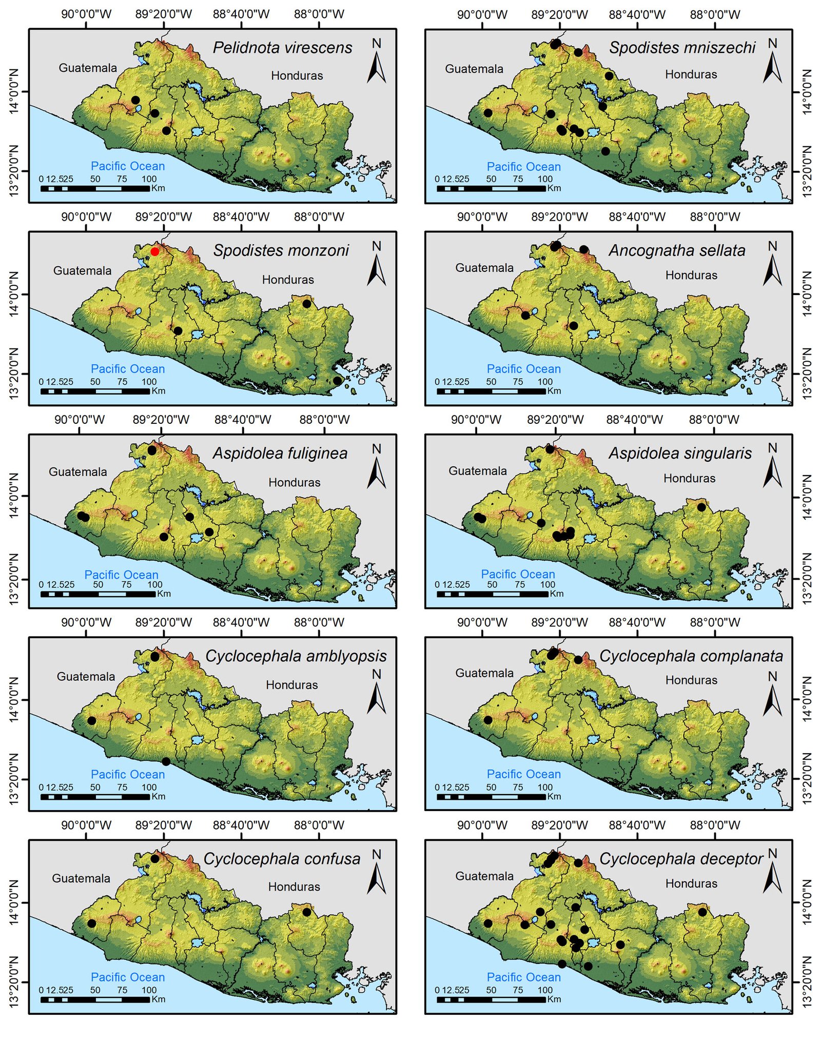 A topographic map of El Salvador (Fig. 1) was used for displaying the distribution of each species with specific locality data in El Salvador. Twenty-one species have no specific locality data. The maps are presented in the same order the species are listed in the catalog. In the case of specimens with a department record only, the departmental capital’s coordinates were used for representation in the map (red points in maps).