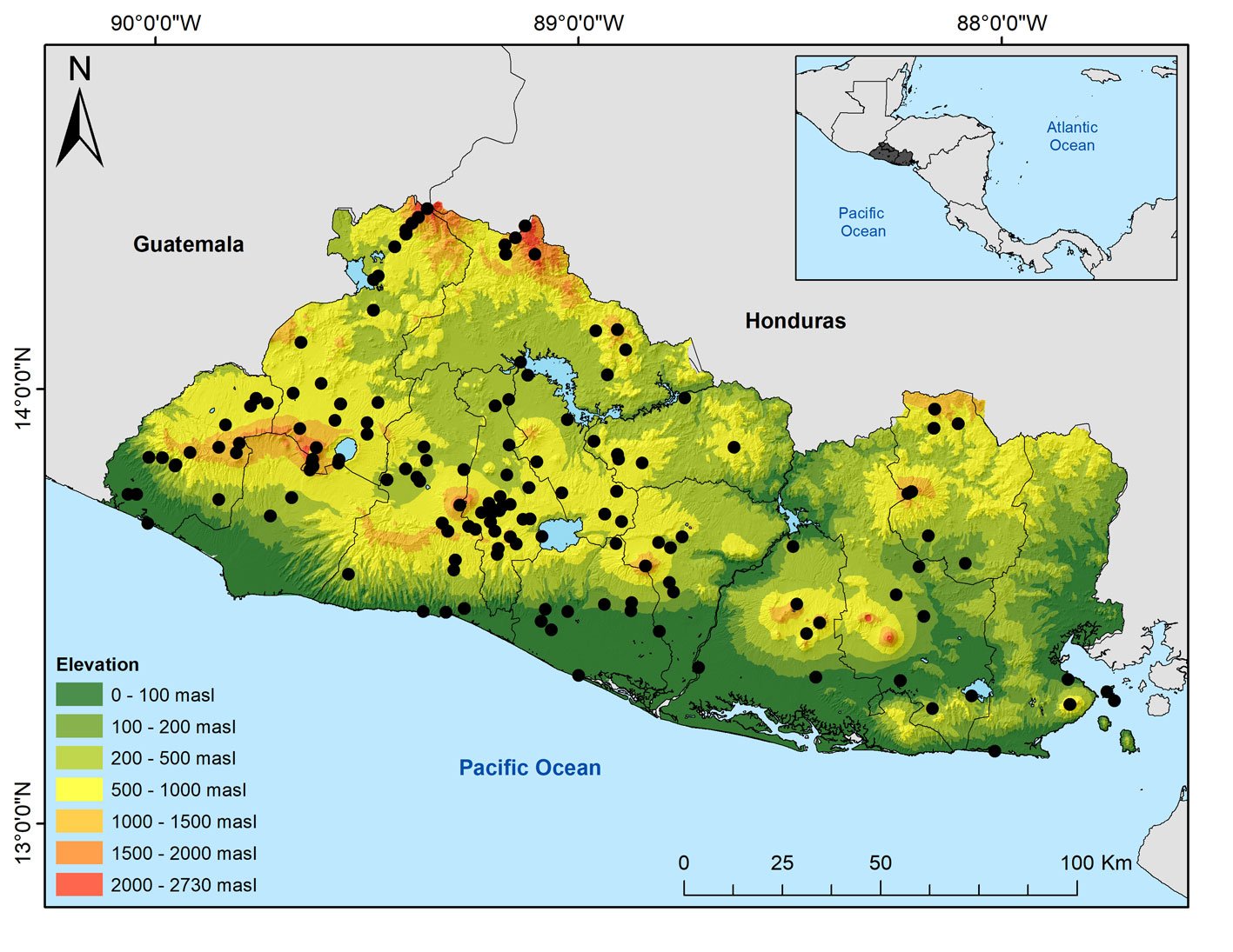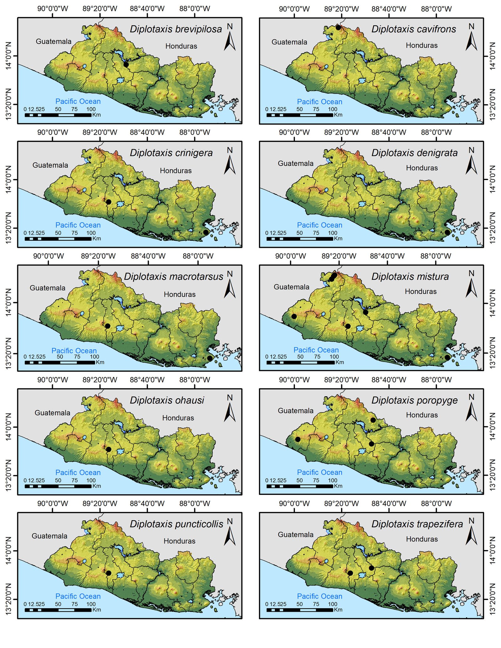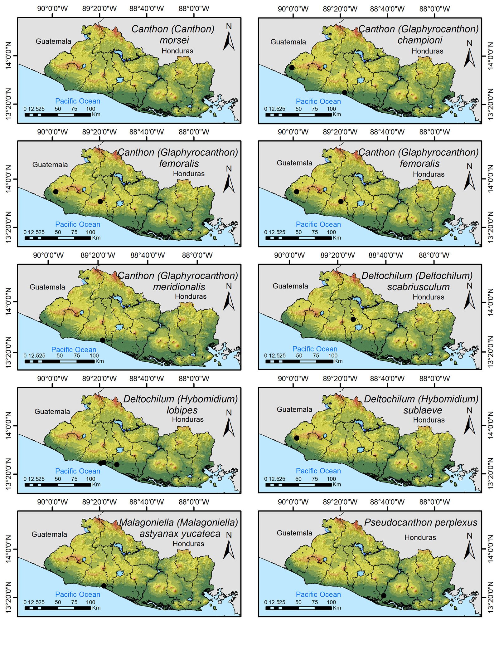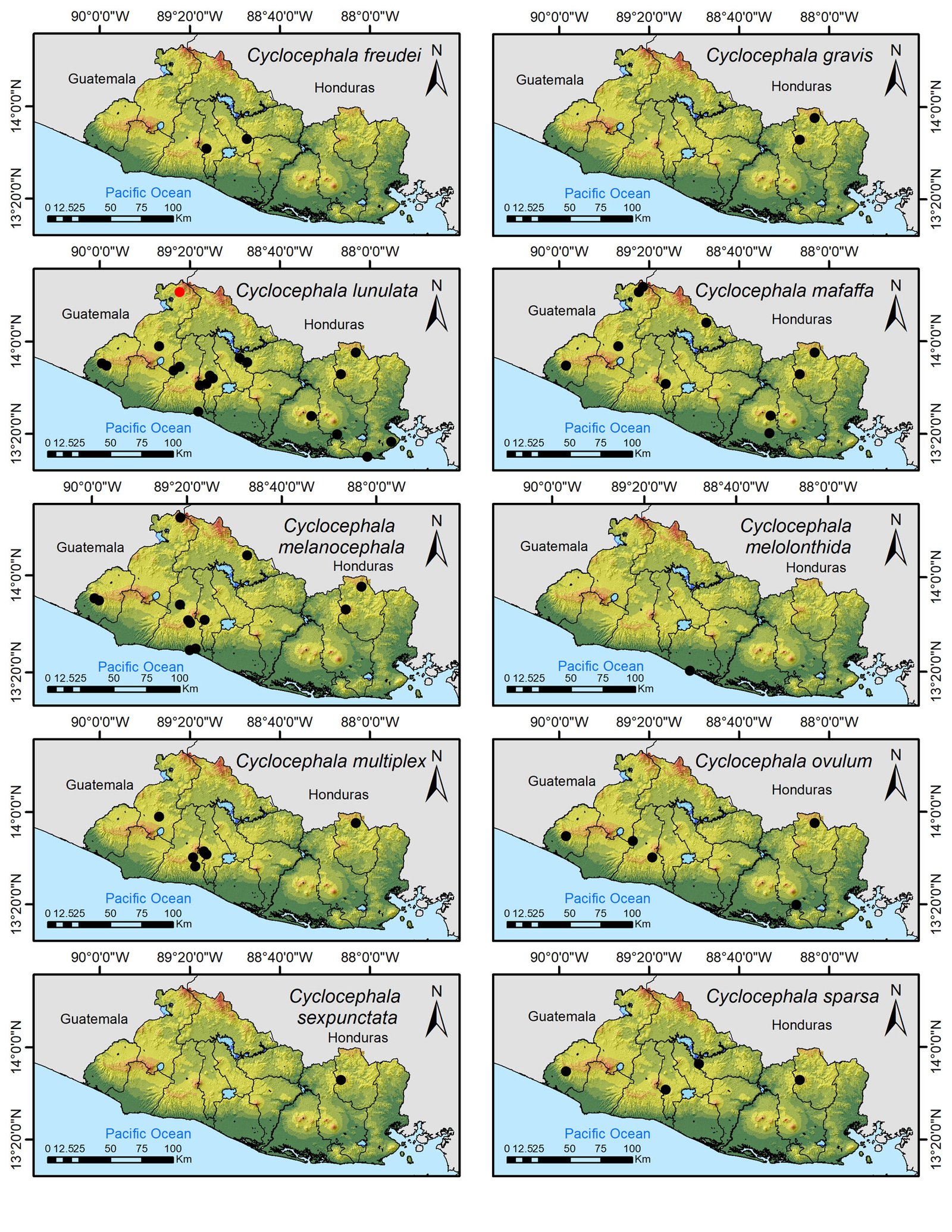 A topographic map of El Salvador (Fig. 1) was used for displaying the distribution of each species with specific locality data in El Salvador. Twenty-one species have no specific locality data. The maps are presented in the same order the species are listed in the catalog. In the case of specimens with a department record only, the departmental capital’s coordinates were used for representation in the map (red points in maps).