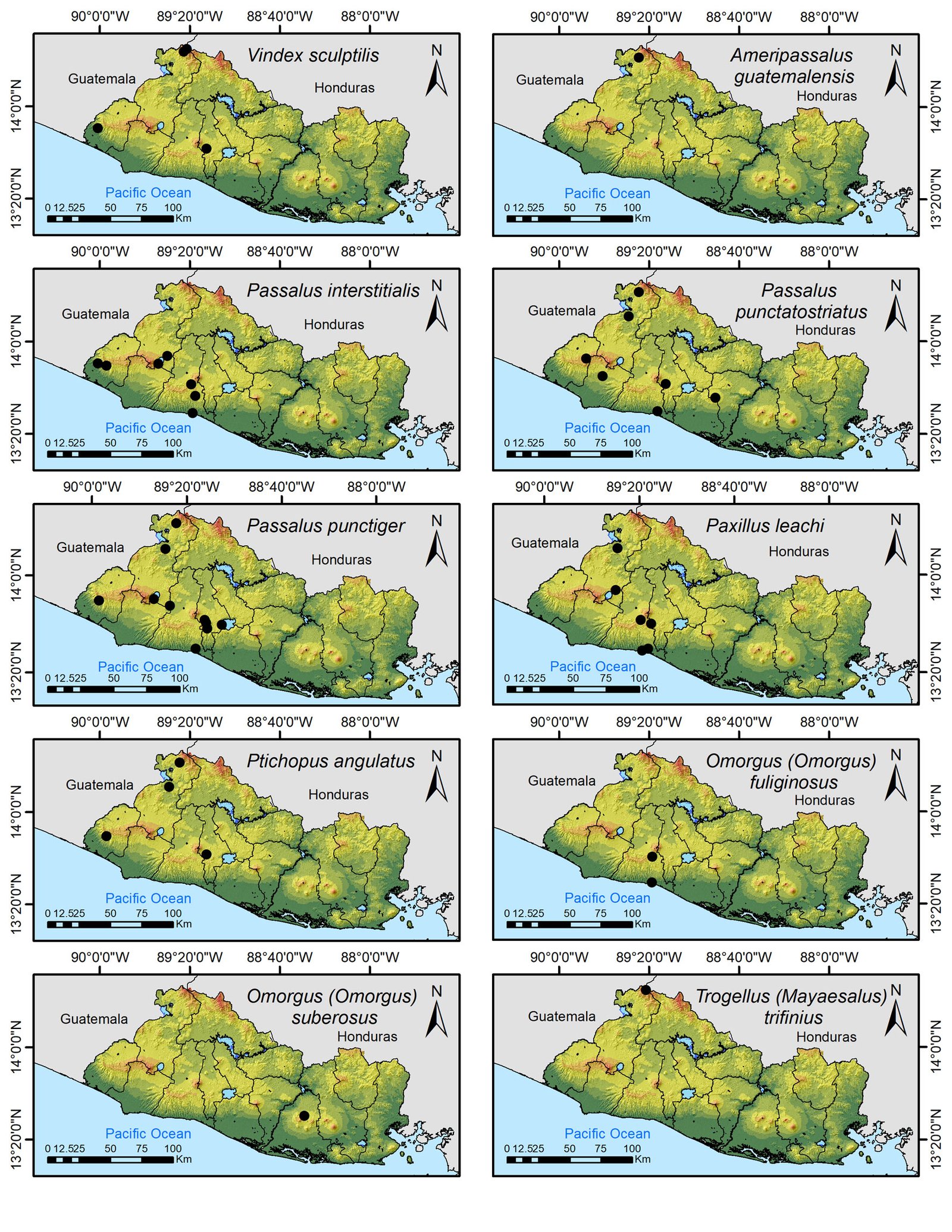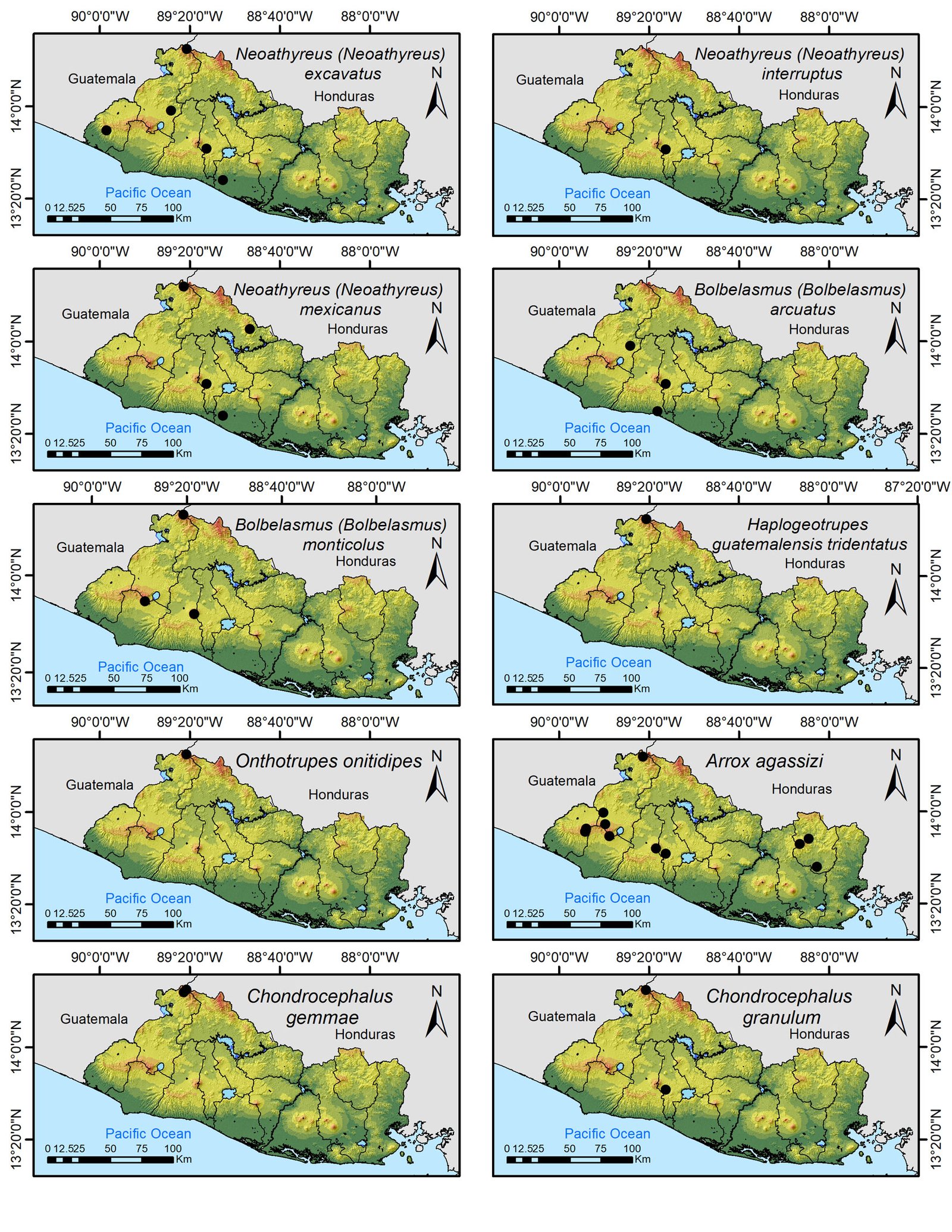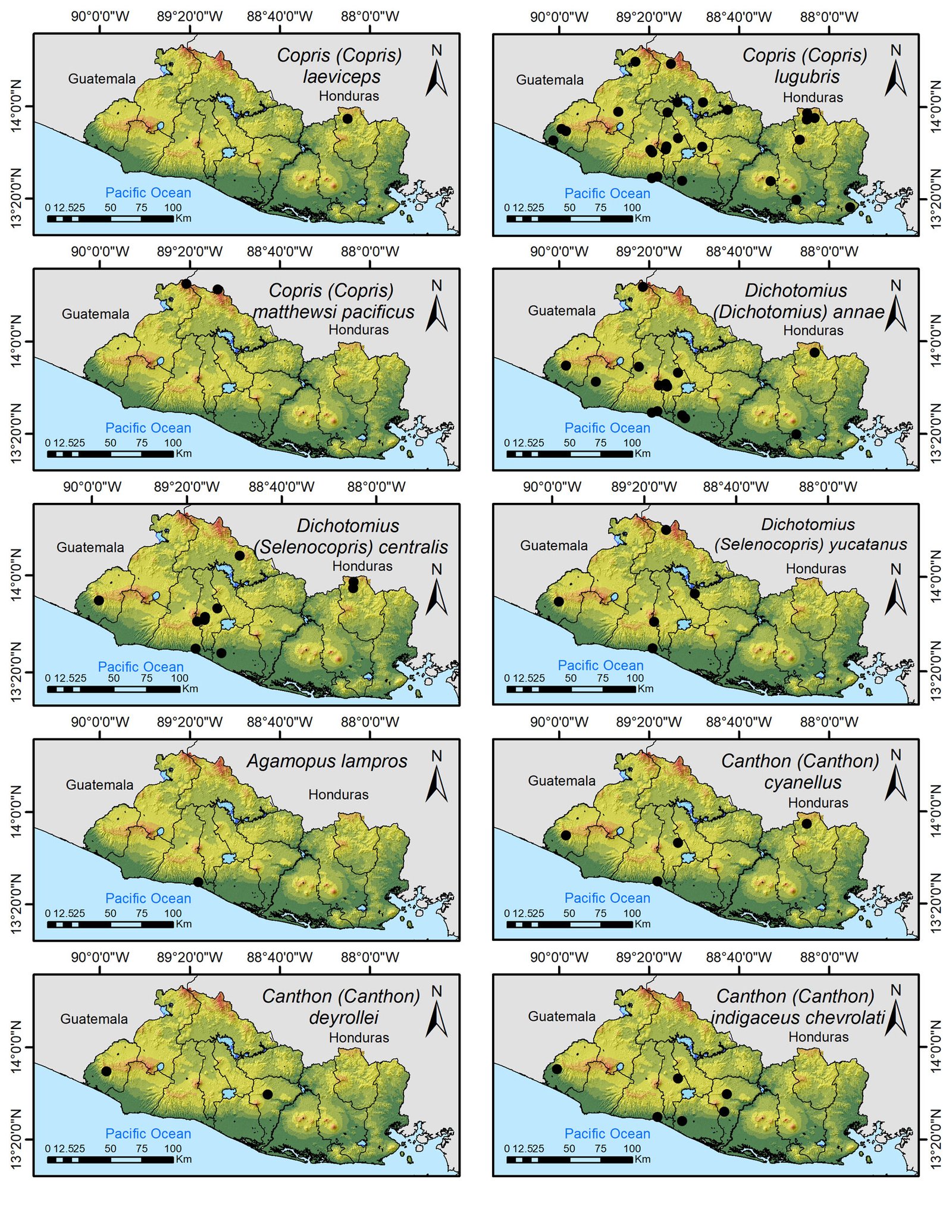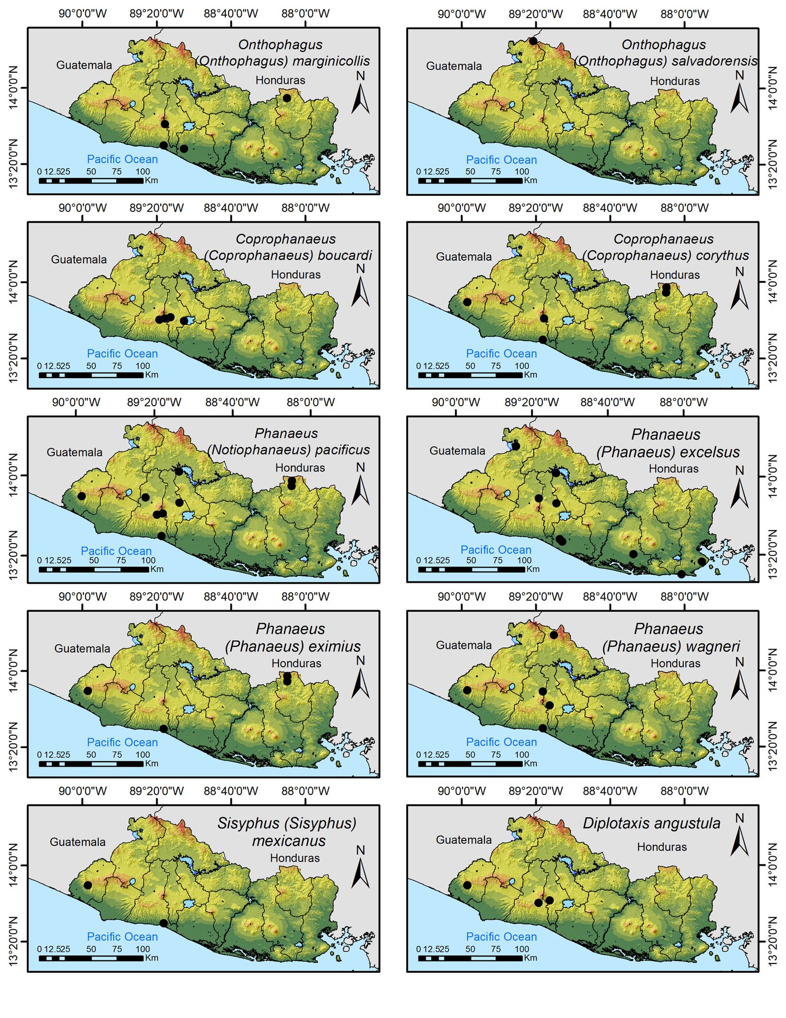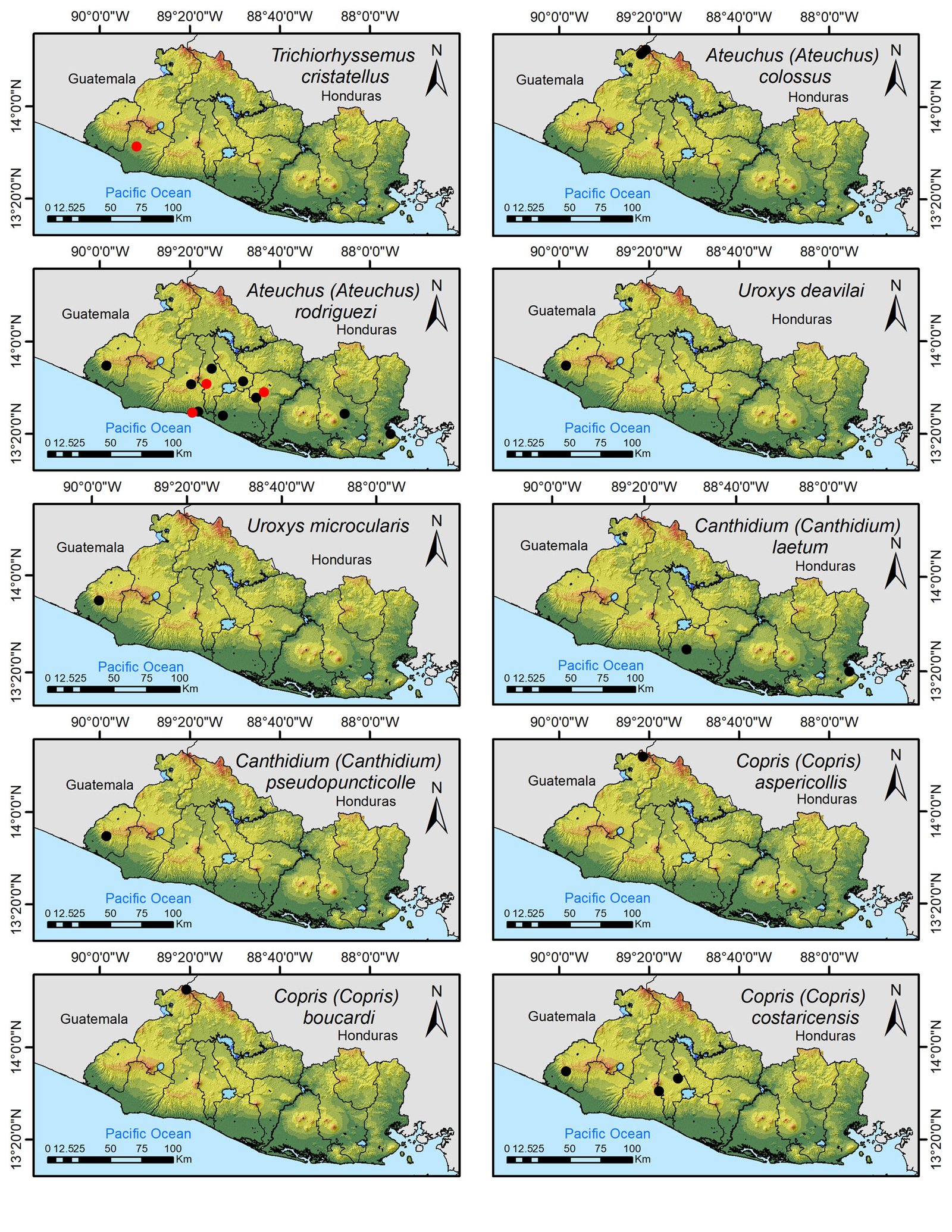 The compilation of data on the Scarabaeoidea known to occur in El Salvador is based on published taxonomic and ecological literature and label data with specimens available from the following collections: CMNC – Canadian Museum of Nature, Ottawa, Canada; CNCI – Canadian National Collection of Insects, Ottawa, Canada; DZUP – Coleção Entomológica Padre Jesus Santiago Moure, Departamento de Zoologia, Universidade Federal do Paraná, Curitiba, Brazil; EAPZ – Universidad Zamorano, Francisco Morazán, Honduras; EMEC – Essig Museum of Entomology, University of California, Berkeley, California, USA; FMNH – Field Museum of Natural History, Chicago, Illinois, USA; IFIT-CP – Instituto de Fitosanidad, Campus Montecillo, Colegio de Postgraduados, Mexico; MUHNES – Museo de Historia Natural de El Salvador, San Salvador, El Salvador; MZSP – Museu de Zoologia, Universidade de São Paulo, São Paulo, Brazil; RDCC – Ronald D. Cave Private Collection, Port St. Lucie, Florida, USA; TAMU – Texas A&M University, College Station, Texas, USA; UNSM – University of Nebraska State Museum, Lincoln, Nebraska, USA.
