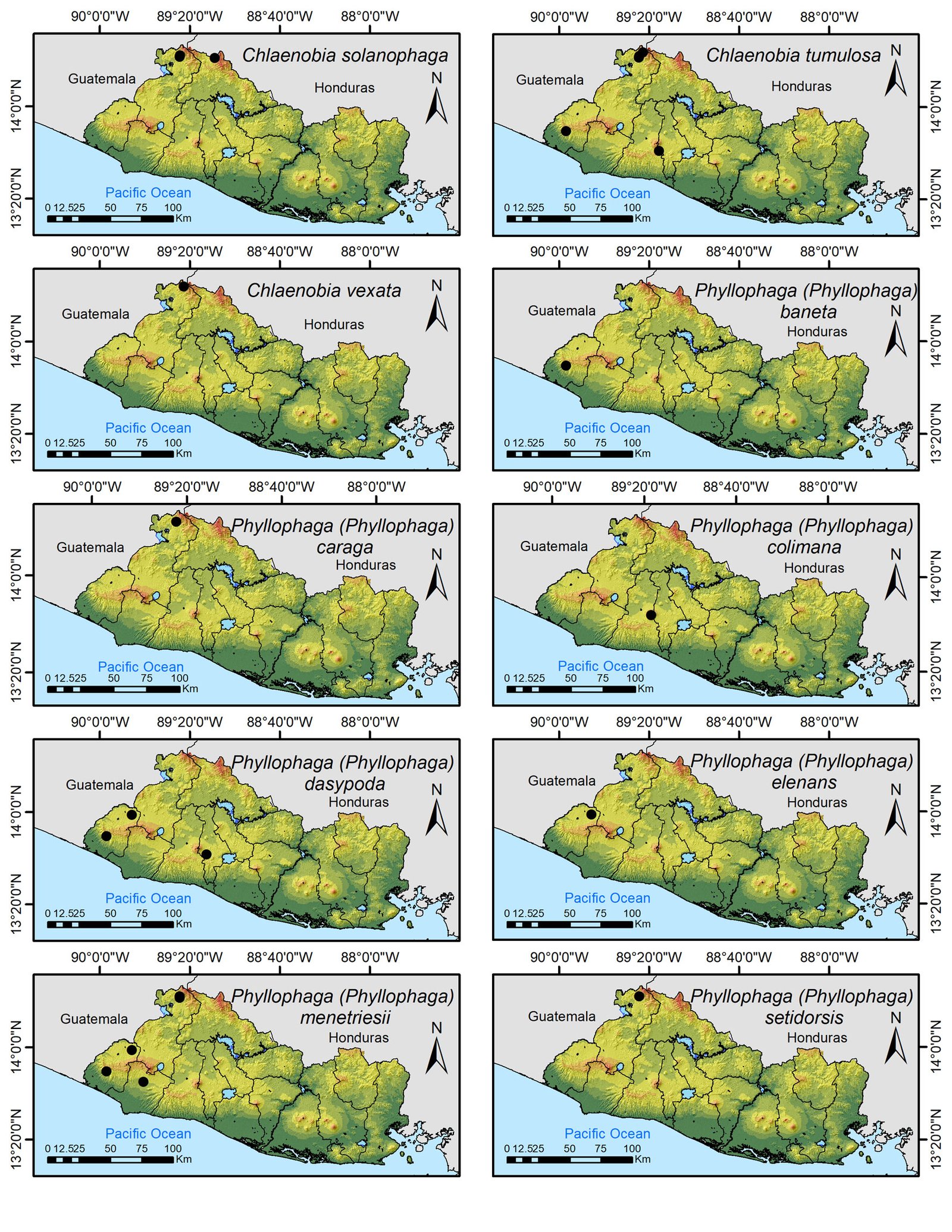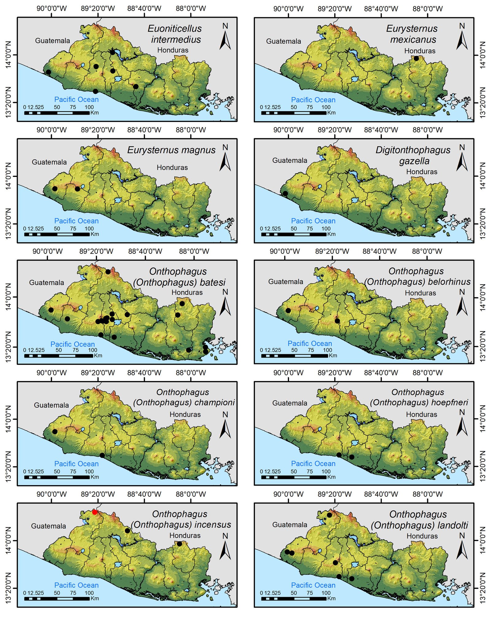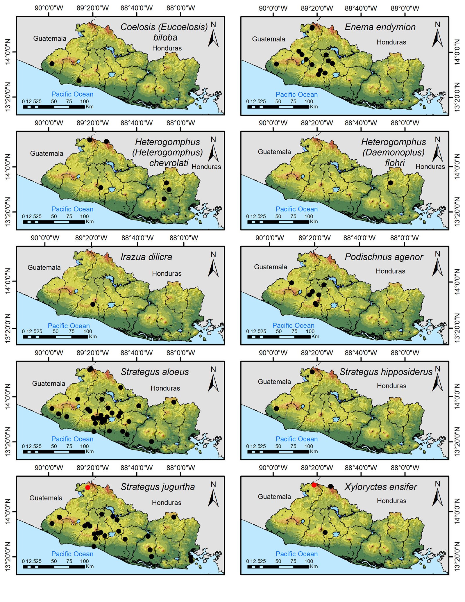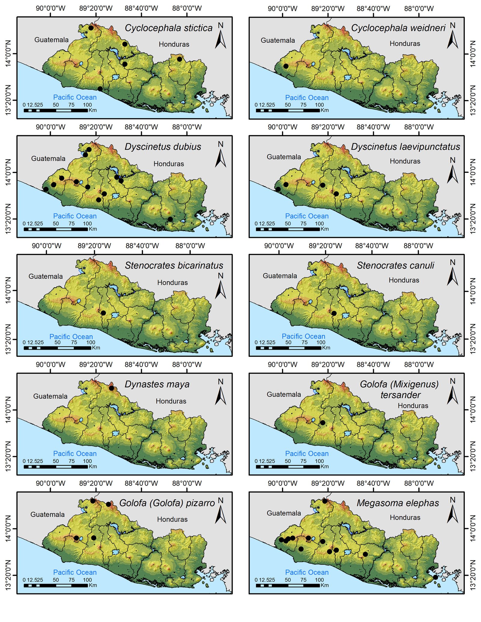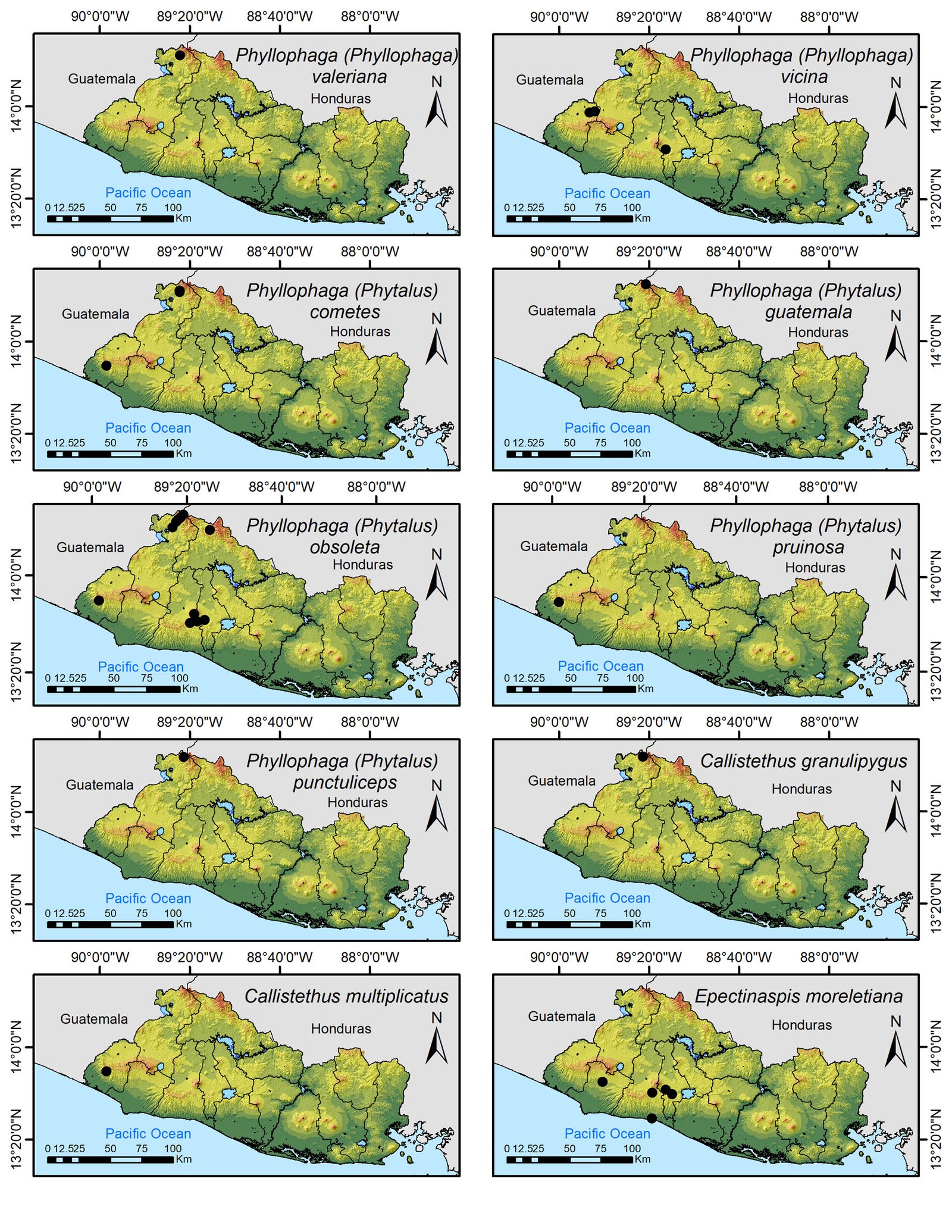 The compilation of data on the Scarabaeoidea known to occur in El Salvador is based on published taxonomic and ecological literature and label data with specimens available from the following collections: CMNC – Canadian Museum of Nature, Ottawa, Canada; CNCI – Canadian National Collection of Insects, Ottawa, Canada; DZUP – Coleção Entomológica Padre Jesus Santiago Moure, Departamento de Zoologia, Universidade Federal do Paraná, Curitiba, Brazil; EAPZ – Universidad Zamorano, Francisco Morazán, Honduras; EMEC – Essig Museum of Entomology, University of California, Berkeley, California, USA; FMNH – Field Museum of Natural History, Chicago, Illinois, USA; IFIT-CP – Instituto de Fitosanidad, Campus Montecillo, Colegio de Postgraduados, Mexico; MUHNES – Museo de Historia Natural de El Salvador, San Salvador, El Salvador; MZSP – Museu de Zoologia, Universidade de São Paulo, São Paulo, Brazil; RDCC – Ronald D. Cave Private Collection, Port St. Lucie, Florida, USA; TAMU – Texas A&M University, College Station, Texas, USA; UNSM – University of Nebraska State Museum, Lincoln, Nebraska, USA.