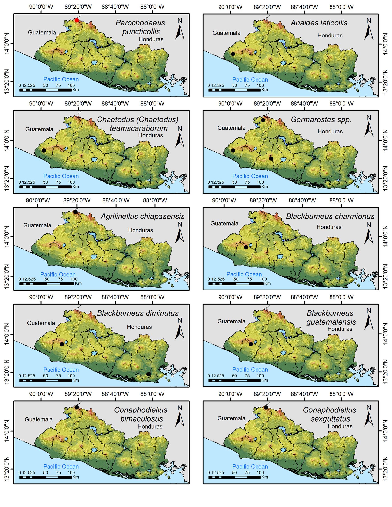 The fauna of El Salvador has been variably studied. The richness and distribution of fish (González-Murcia, 2019; McMahan et al., 2013), amphibians and reptiles (Köhler et al., 2006), birds (Dickey & Van Rossem, 1938; Ibarra-Portillo, 2013), and mammals (Owen & Girón, 2012) have been reasonably inventoried and documented; however, the knowledge on invertebrate animals is quite different. Less than 1% of the literature on Salvadoran biodiversity is about the invertebrate animal fauna (Gallo, 2005), which leaves many gaps in what we know of the distribution of the species. A clear example is Coleoptera, the most speciose order of Insecta, with at least 386,000 described species in 176 families (Bouchard et al., 2017). The species richness of Coleoptera in El Salvador is unknown, but recent efforts have been made to catalog the beetle fauna. For example, Van Roie et al. (2019) documented 420 species and 132 genera of Chrysomelidae, and Pablo-Cea et al. (2021) recorded 96 especies in 38 genera of Staphylinidae. Both families are important for their diverse feeding habits and behaviors in a variety of ecosystems (Asenjo et al., 2013; Jolivet 1988; Navarrete-Heredia, 2002). Also, they are taxonomically diverse families and together with Scarabaeidae, Curculionidae, Carabidae, and Cerambycidae constitute the 6 megadiverse families of Coleoptera (Bouchard et al., 2017).