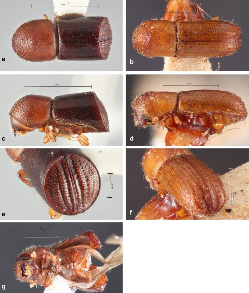 Figura 22. a, Vista dorsal de Amasa parviseta (tomada de Atkinson, 2025); b, vista dorsal de Xyleborinus saxesenii (tomada de Atkinson, 2025); c, vista lateral de A. parviseta (tomada de Atkinson, 2025); d, vista lateral de X. saxesenii (tomada de Atkinson, 2025); e, vista posterior de A. parviseta (tomada de Atkinson, 2025); f, vista posterior de X. saxesenii (tomada de Atkinson, 2025); g, vista ventral de A. parviseta (tomada de Atkinson, 2025).