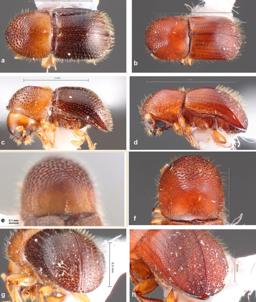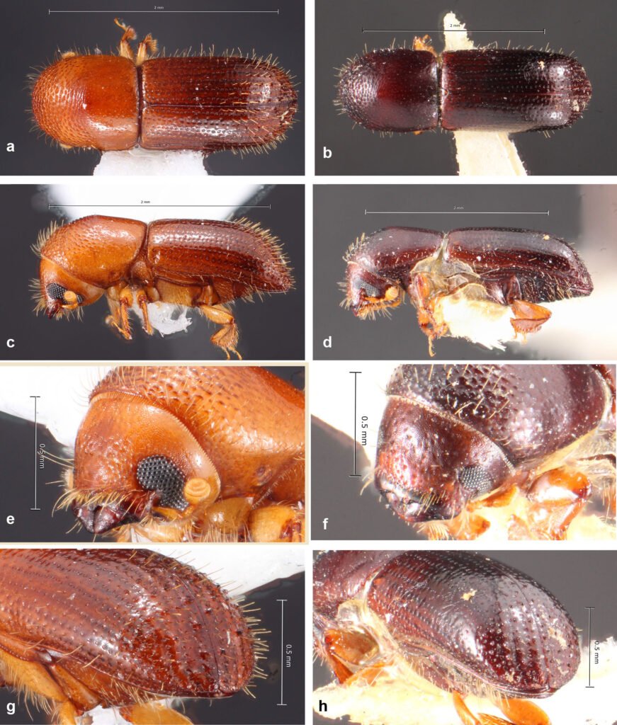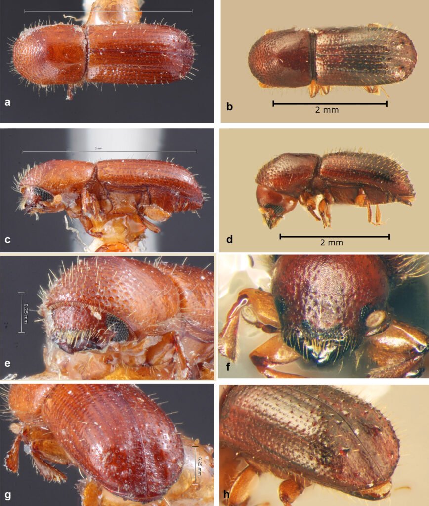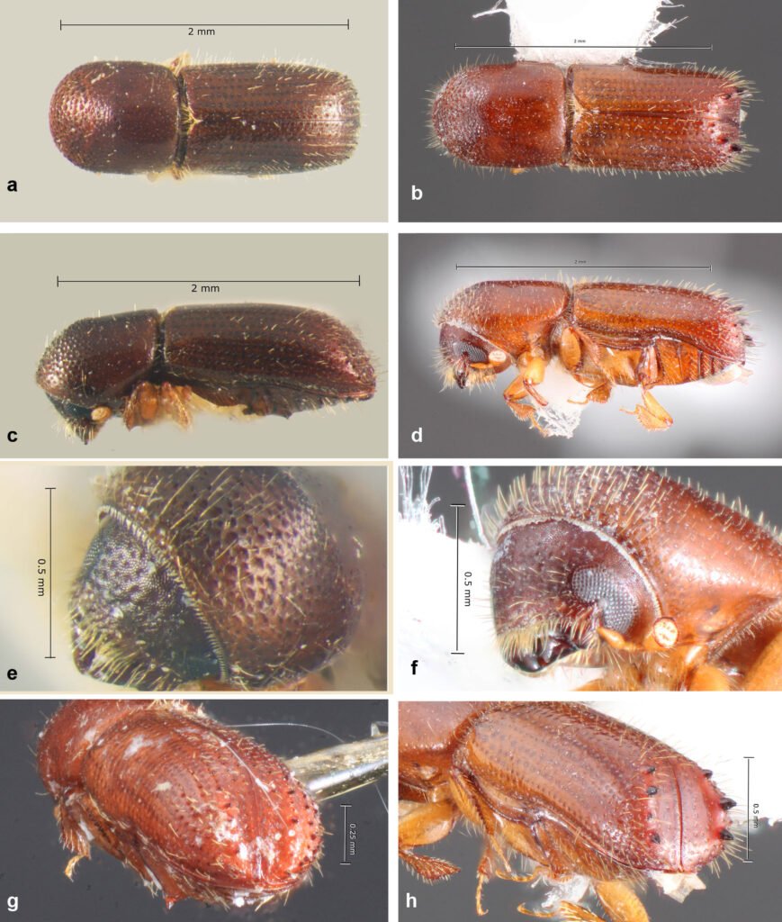 Figura 23. a, Vista dorsal de Xyleborinus linearicollis (tomada de Atkinson, 2025); b, vista dorsal de X. sentosus (tomada de Atkinson, 2025); c, vista lateral de X. linearicollis (tomada de Atkinson, 2025); d, vista lateral de X. sentosus (tomada de Atkinson, 2025); e, vista frontal de X. linearicollis (tomada de Atkinson, 2025); f, vista frontal de X. sentosus (tomada de Atkinson, 2025); g, vista posterior de X. linearicollis (tomada de Atkinson, 2025); h, vista posterior de X. sentosus (tomada de Atkinson, 2025).