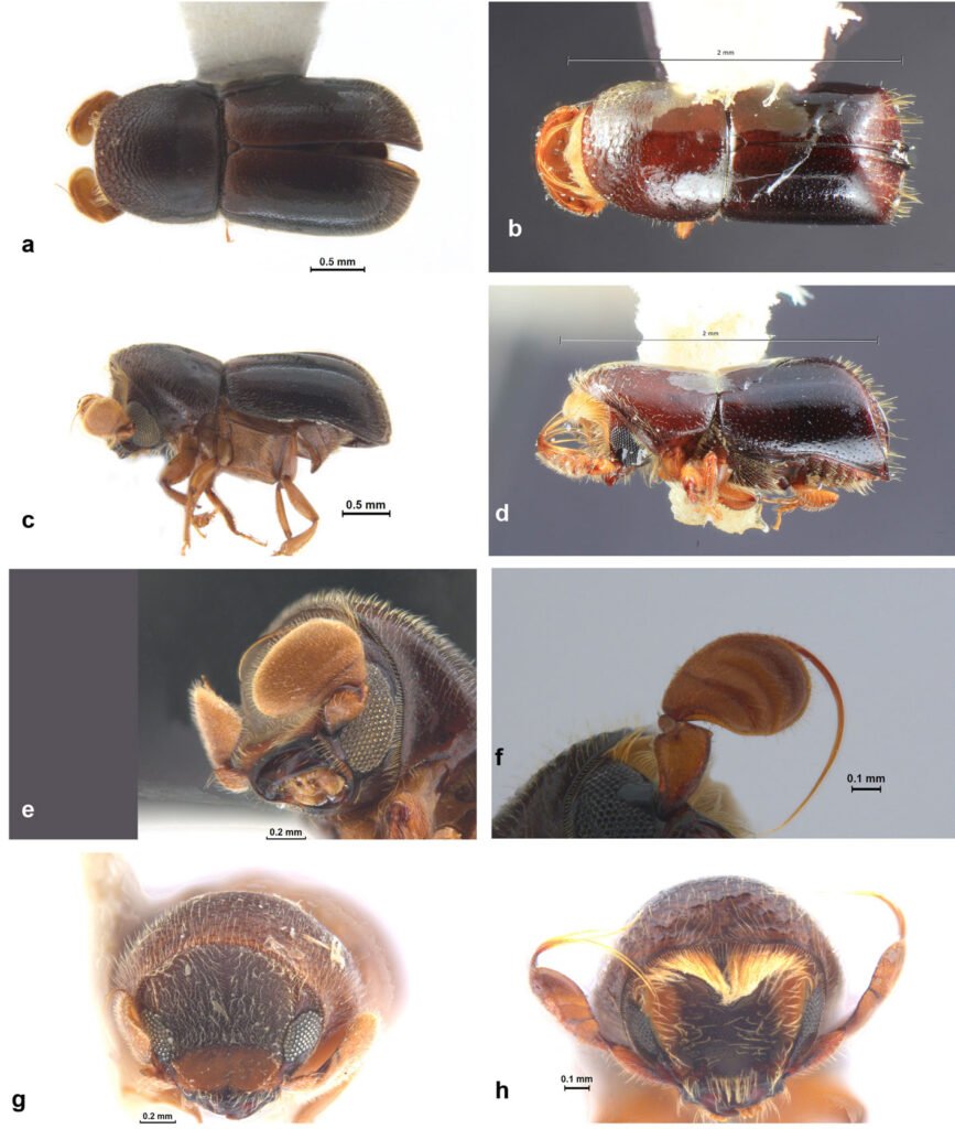 Figura 23. a, Vista dorsal de Xyleborinus linearicollis (tomada de Atkinson, 2025); b, vista dorsal de X. sentosus (tomada de Atkinson, 2025); c, vista lateral de X. linearicollis (tomada de Atkinson, 2025); d, vista lateral de X. sentosus (tomada de Atkinson, 2025); e, vista frontal de X. linearicollis (tomada de Atkinson, 2025); f, vista frontal de X. sentosus (tomada de Atkinson, 2025); g, vista posterior de X. linearicollis (tomada de Atkinson, 2025); h, vista posterior de X. sentosus (tomada de Atkinson, 2025).