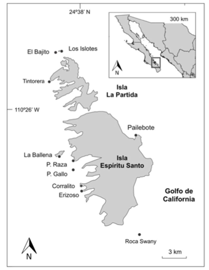El archipiélago Espíritu Santo se encuentra al oriente de la bahía de La Paz (24º28’17” N, 110º19’57” O; fig. 1). Topográficamente, el litoral oriental de la isla es rocoso y homogéneo, mientras que la costa occidental cuenta con entrantes y salientes que forman zonas protegidas. Las zonas someras en el lado oeste de Espíritu Santo permiten la formación de arrecifes rocosos con la presencia de parches coralinos distribuidos de manera discontinua (Reyes-Bonilla y López-Pérez, 2009). Se registran temperaturas mínimas de 20 ºC a finales del invierno (febrero) y máximas de 30 ºC a mediados del verano (agosto). Adicionalmente, se observan corrientes de menor intensidad en la parte norte y de mayor intensidad en la parte sur (canal de San Lorenzo) (Conanp, 2018).