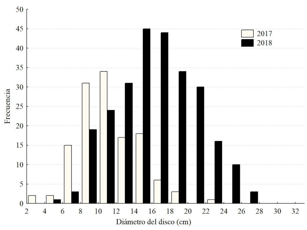 Se midieron 356 individuos de A. planci en 2017 y 2018. Los especímenes de 2017 fueron en promedio 5.5 cm más pequeños que los de 2018 (tabla 1, fig. 2; t de Student para varianzas desiguales t318 = 13.413, p < 0.001). La distribución de tallas de los individuos se presenta en las figuras 2 y 3, y puede observarse que en 2017 solamente un individuo alcanzó un diámetro de disco superior a 20 cm, mientras que en el año siguiente 21 de 227 organismos (9.3%) superan ese umbral. En 2017, 9% de las estrellas fueron menores a 8 cm de diámetro.