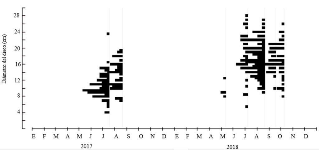 La hipótesis anterior se sustenta por los datos del modelo de edad y también por las tallas observadas en el campo. Los diámetros de disco esperados para los ejemplares (promedios de 11.43 ± 0.29 cm en 2017 y 16.96 ± 0.23 cm en 2018; tabla 1) coinciden con los reportados por Rodríguez-Villalobos y Ayala-Bocos (2021) para la zona de El Corralito en la isla Espíritu Santo (fig. 1) en 2017 (14.72 ± 2.85 cm de diámetro), lo que indica que para ese año la población de Acanthaster en la zona de estudio estaba compuesta fundamentalmente de individuos menores a 3 años, nacidos en 2015-2016 (fig. 6).