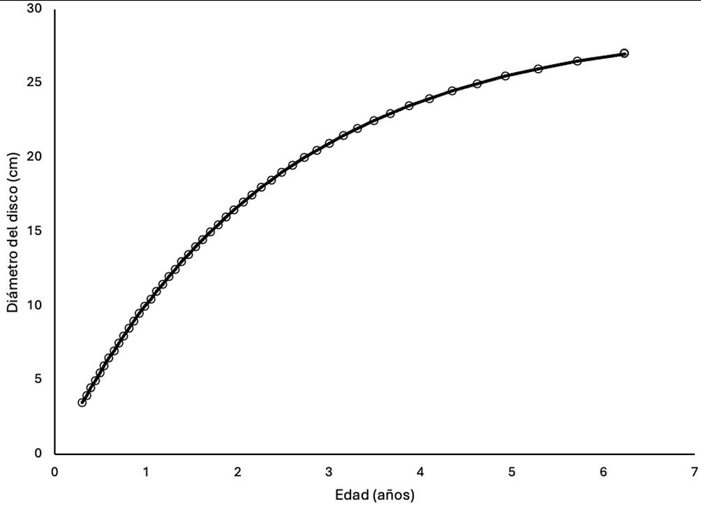Una vez con los parámetros L∞ y K, se procedió a trazar la curva teórica de crecimiento de la especie (expresando el diámetro en cm en relación con la edad del organismo en intervalos de 0.25 años) a construir la tabla diámetro de disco-edad, con lo cual se determinó la edad de los individuos muestreados en 2017 y 2018. Tomando en cuenta que los estudios previos sobre crecimiento de la estrella corona de espinas han sido hechos con base en el diámetro total de los individuos (Zann et al., 1987), se trazó una curva teórica para evaluar el crecimiento en esta dimensión, considerando que Glynn (1982) determinó que el diámetro total de Acanthaster en Panamá podría ser aproximado a partir del diámetro del disco ya que este representa 56% del total.