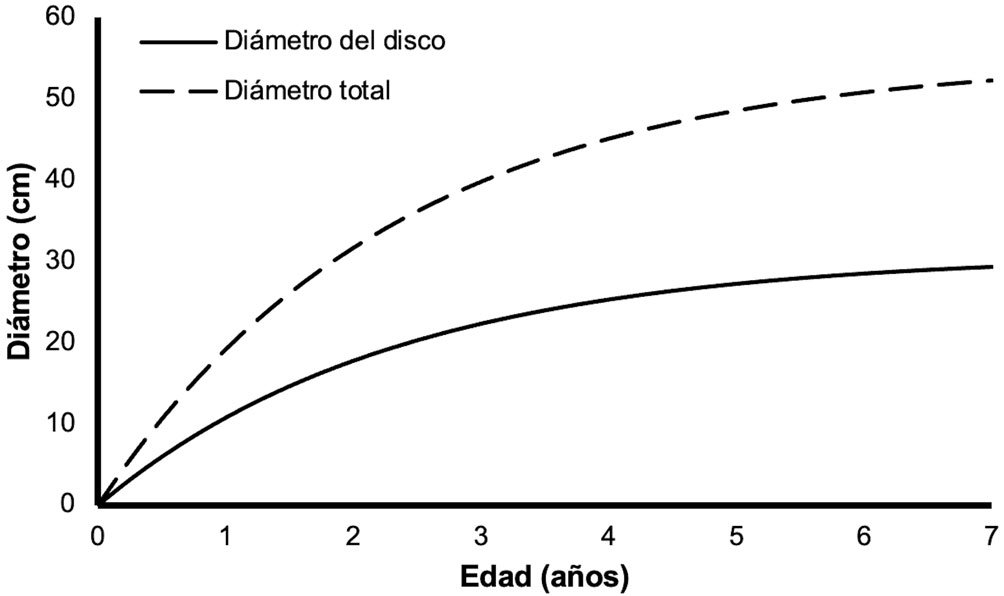 Los organismos crecen rápidamente de tal modo que al final del año 1 cuentan con 10.7 cm de diámetro de disco, para el año 2 alcanzan 17.7 cm, y para el 3 llegan a 22.2 cm. El modelo teórico junto con la edad estimada de los individuos se presenta en la figura 4. Para facilitar comparaciones con otras publicaciones donde se hace referencia a la talla de A. planci en el Pacífico americano y donde la medida de los organismos se hizo tomando en cuenta el diámetro total, en la figura 5 se presenta la curva teórica de crecimiento aquí generada y la esperada para el diámetro total, considerando que el diámetro del disco representa 55% del diámetro total de la estrella según Glynn (1982).