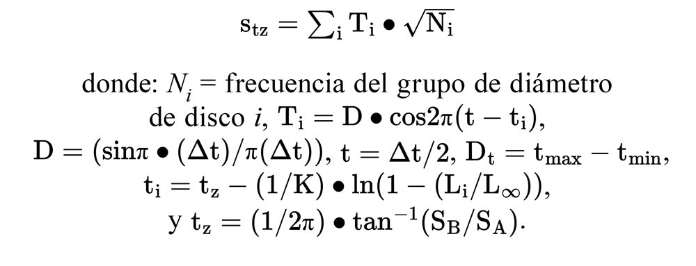 donde SAy SB son los valores de bondad de ajuste (“scores”) obtenidos en tiempo calendario (stz) para SA = 0 y SB = 0.25 años a partir del origen de la curva de crecimiento de VB. Las ecuaciones aplicadas son: