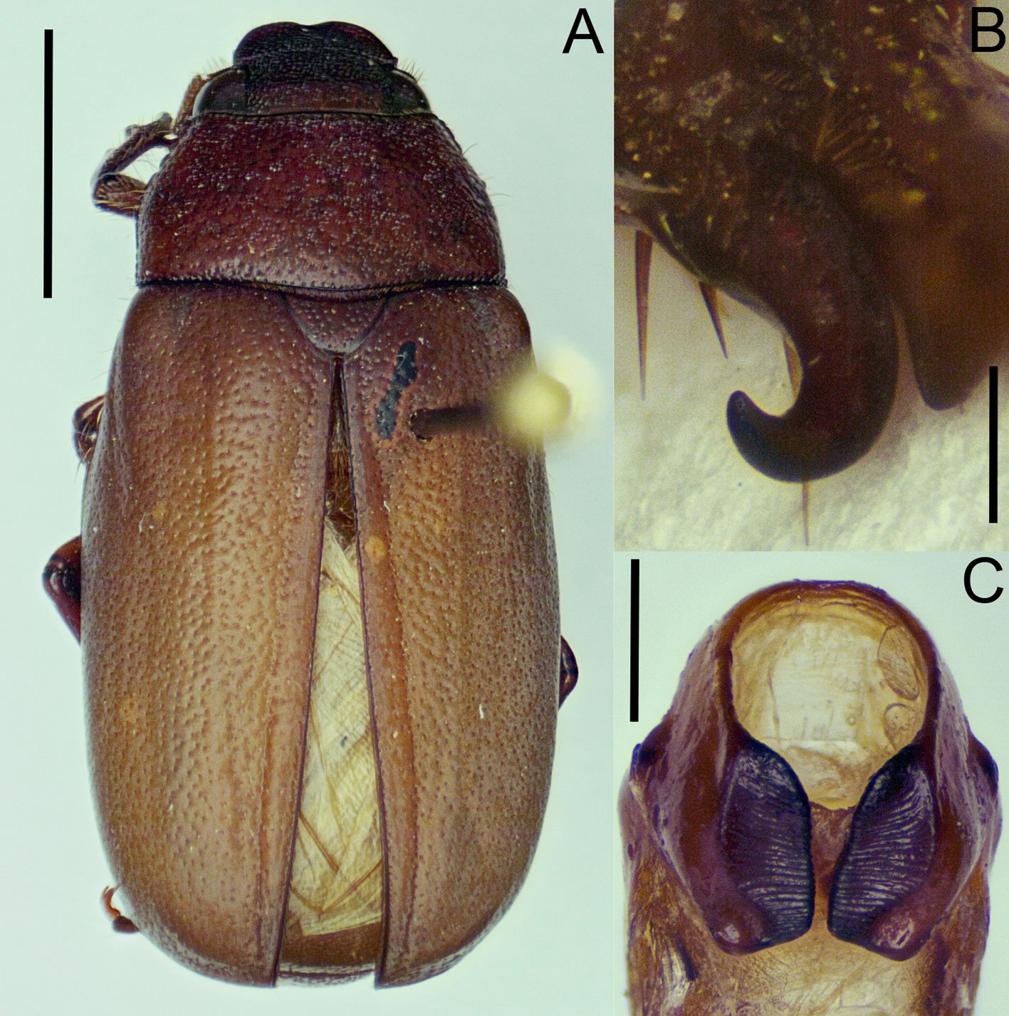 Descripción. Holotipo: (♂, IEXA) con etiqueta roja. Longitud total 19.0 mm, ancho máximo 6.0 mm. Cabeza y pronoto pardo rojizos, élitros, patas y abdomen de color amarillo pajizo brillante (fig. 2A, B). Clípeo semitrapezoidal, con ápice redondeado, ligeramente bilobulado y borde anterior poco elevado; 3.2 veces más ancho que largo; disco clipeal glabro, convexo, con puntos circulares profundos, irregularmente distribuidos (figs. 2A, 3A). Sutura fronto-clipeal bien marcada, ligeramente sinuada. Frente glabra, 2.0 veces más ancha que larga, en sus 2/3 anteriores casi plana con puntos circulares profundos grandes y puntos circulares pequeños irregularmente distribuidos; tercio posterior completamente liso, con muy pequeños puntos someros (figs. 2A, 3A).