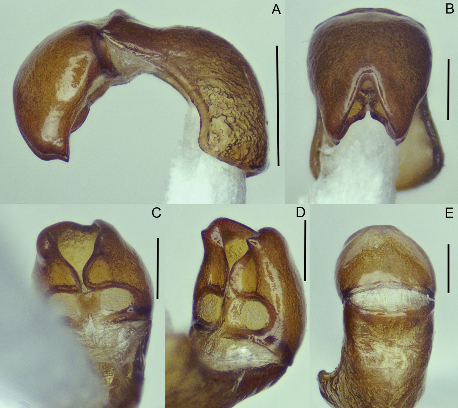 Cápsula genital masculina con parámeros completamente fusionados en la falobase; extremos apicales punteados y ligeramente divergentes, formando una estructura semicónica, recurvada; ventralmente cada parámero con proyección excavada central que convergen en la parte media, y en la parte basal con una concavidad circular que en conjunto asemejan a un número “8” (fig. 6). Superficie del tectum ampliamente cóncava. Edeago carece de estructura de soporte esclerosada y de ornamentos conspicuos.
