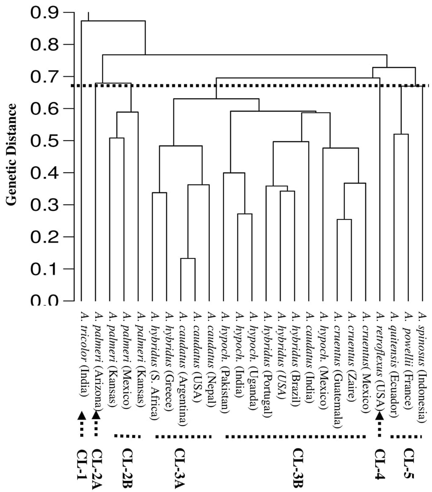 RAPD analyses performed on grain amaranth (Adhikary & Pratt, 2015; Akin-Idowu et al., 2016; Popa et al., 2010; Sompornpailin & Khanthang, 2015; Stefunova et al., 2015), exhibited genetic diversity at intra and interspecific levels. At the interspecific level, Popa et al. (2010) found 37% polymorphism among grain amaranths collected from different geographic regions, whereas Akin-Idowu et al. (2016) revealed a higher rate, bordering at 81%. At the intraspecific level, the percentage of polymorphism varied between 70 and 100% (Stefunova et al., 2015) or from 19 to 72% (Sompornpailin & Khanthang, 2015). The percentage of polymorphism was found to be 71.43% in A. hypochondriacus, 100% in A. cruentus and A. caudatus, and 84.85% in A. tricolor (Patel et al., 2014). The cluster analysis of the RAPD data grouped accessions of A. hypochondriacus with those of both A. caudatus and A. cruentus (Sompornpailin & Khanthang, 2015), and revealed that A. cruentus stood apart while A. hypochondricus and A. caudatus overlapped (Mandal & Das, 2002).