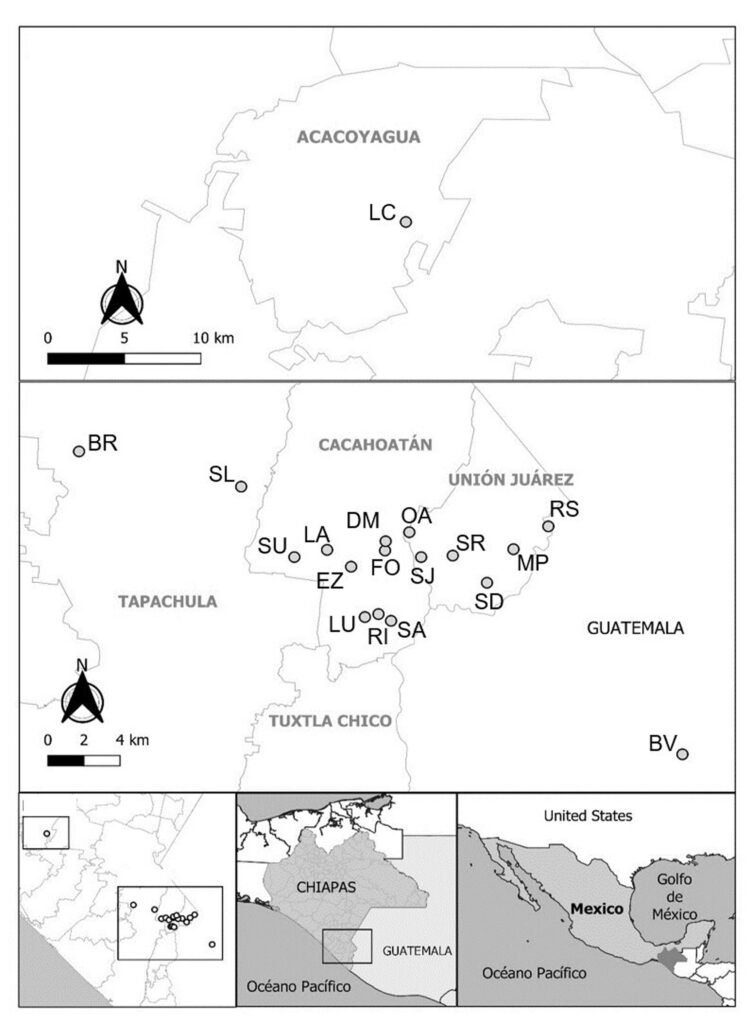 | Unión Juárez | Santo Domingo | Mexico | SD | 15°01’37.5’’ | 92°06’06.9’’ |