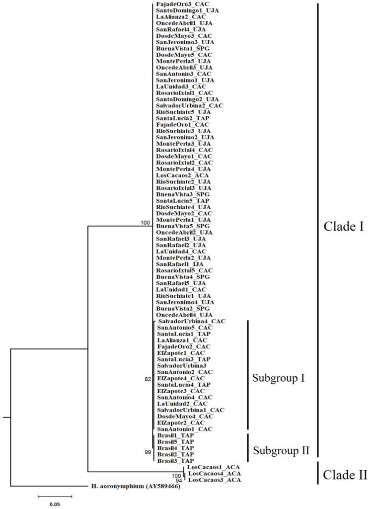 The tree topology revealed 2 independent clades with high support (> 90%). Clade I formed by 3 monophyletic groups, which corresponds to 96% of the specimens distributed in the municipalities of Tapachula, Cacahoatán, Unión Juárez, and San Pablo (Guatemala). Inside clade I, 2 subgroups were observed. The first subgroup had a bootstrap support value of 82%, while the second subgroup showed a higher support, with a bootstrap value of 99%. Clade II formed by 3 specimens belonging to the LC (Acacoyagua) population. A phylogenetic separation (16.5%) was observed between clade I and clade II specimens (Fig. 2).
