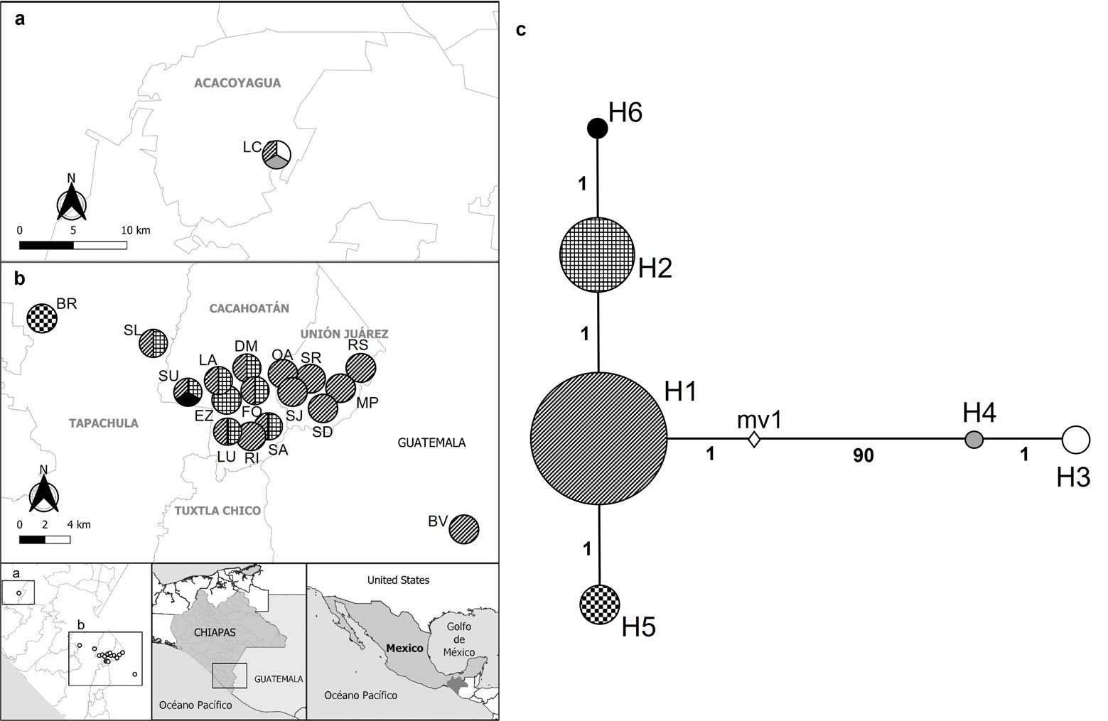 Figure 3. a-b, Distribution of the Metaparasitylenchus hypothenemi haplotypes in the 5 municipalities from the Soconusco region, Chiapas, Mexico and the municipality of San Pablo, Guatemala; c, haplotype network development using PopART v. 1.7. Wefts of the circles represent each haplotype. The size of the circles is proportional to the frequency of the haplotype inside the populations. The numbers on the lines connecting the haplotypes represent the mutational steps. The white rhombus (mv1) represents an extinct haplotype or an unsampled point. LC, Ejido Los Cacaos; LA, La Alianza; EZ, El Zapote; LU, La Unidad; DM, Dos de Mayo; FO, Faja de Oro; RI, Rosario Ixtal, SA, San Antonio: BV, Buena Vista; SU, Salvador Urbina; SL, Santa Lucía; BR, Brasil; SD, Santo Domingo; SR, San Rafael; SJ, San Jerónimo; MP, Monte Perla; RS, Río Suchiate; OA, Once de Abril.