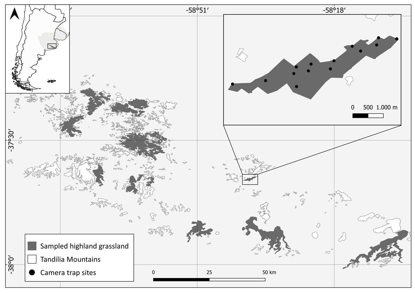 The Tandilia Mountains harbour the last highland grassland remnants of the Pampas ecoregion, which act as a refuge for biodiversity, including several endemic species (Herrera et al., 2019; Martínez-Aguirre et al., 2021; Vera et al., 2021). The Pampas ecoregion, one of the most extensive grasslands in the world, has been almost entirely replaced by agriculture and forestry (Herrera et al., 2019; Isacch et al., 2016; Nanni et al., 2020). These land use changes, combined with other threats such as the increase in fire regimes, urbanization, and unsustainable grazing in natural grasslands, have resulted in habitat fragmentation and loss and population decline of grassland species, especially birds and large carnivores (Azpiroz et al., 2012; Bilenca & Miñarro, 2004; Medan et al., 2011). Although the Tandilia Mountains are considered a Valuable Grassland Area for South America (D. Bilenca & Miñarro, 2004), less than 1% of these grasslands are under protected areas, and few studies have been conducted to gain ecological information regarding bird and mammal communities (Trofino-Falasco et al., 2022; Velasco et al., 2013). Given the urgent need to identify key conservation sites, camera traps could be an option to conduct rapid surveys in these groups. However, the efficiency of this tool has not been tested for these species in this habitat.