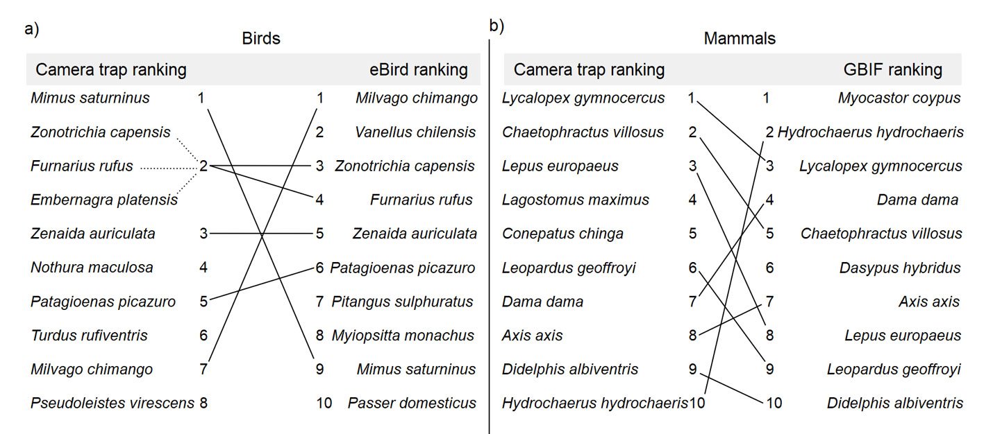 We compared the camera trapping richness with the richness reported in online databases to assess potential bird and mammal richness and their detection frequencies in the Tandilia Mountains. We analyzed data from 2 open-access databases: eBird (www.ebird.org) and the Global Biodiversity Information Facility (GBIF, www.gbif.org).