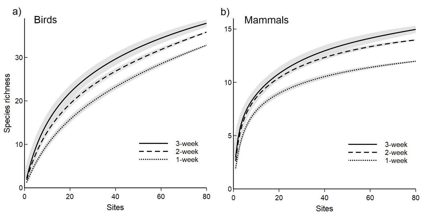 To estimate the number of sampling sites necessary to detect bird and mammal species richness, we used a subset of camera traps that were active for at least 20 days. We performed species accumulation curves for 3 sampling lengths: 1, 2, and 3 weeks. We also performed species accumulation curves for 2 species groups: nesting grassland birds and carnivores. These species groups are commonly used in many bird and mammal research and provide good information regarding their ecological role in grassland ecosystems (Caruso et al., 2020; Winter & Faaborg, 1999). We analyzed species richness as a function of effort measured as the number of trap days and capture records. Reported values are mean ± standard error (range). We performed species accumulation curves using the R package Vegan (Oksanen, 2017).
