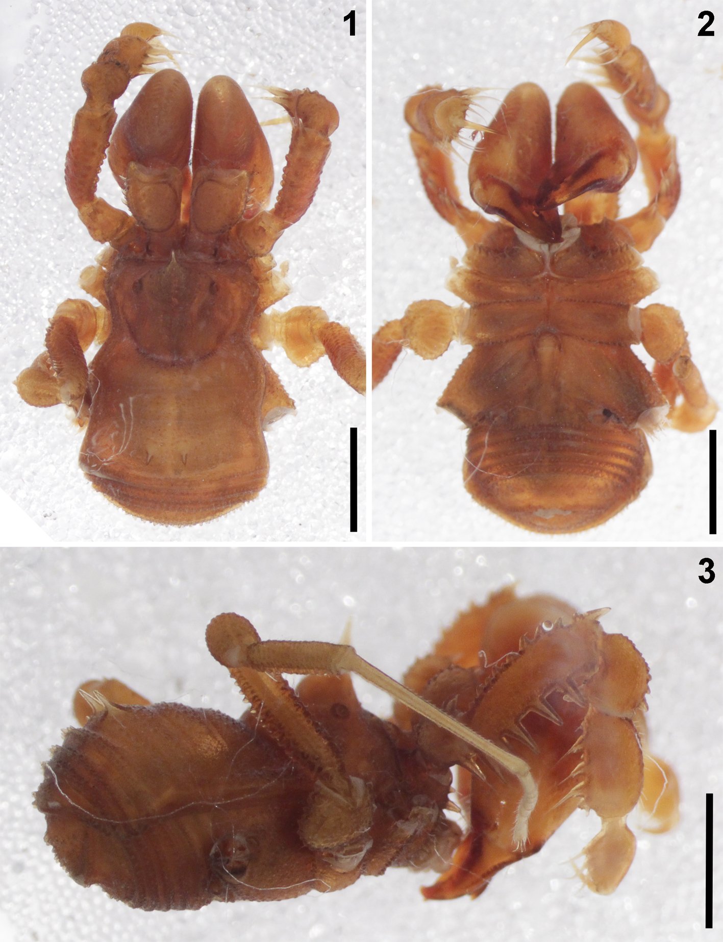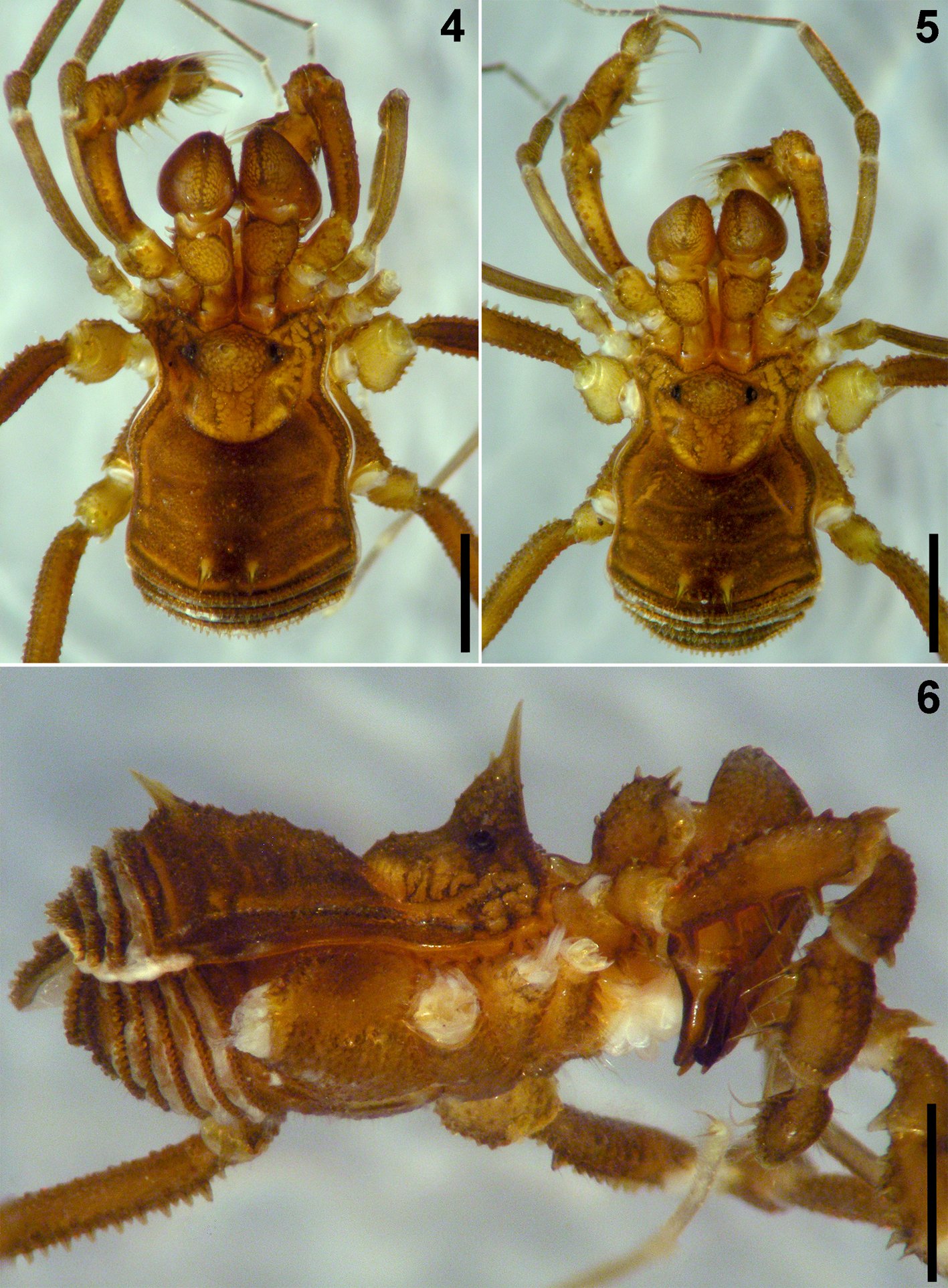 Redescription (male). Scutum length 4.0 mm. Scutum zeta type (ζ), mid-bulge slightly convex, posterior margin slightly wider than scutum width at level of mid-bulge. Ocularium at the frontal margin of scutum, very robust, with the base elliptical and apically armed with large spine. Mesotergum ornate with many small tubercles, covering homogeneously every area. Sulcus I and II almost straight, sulcus III retrocurved and almost absent, areas III and IV barely fused. Area III with a pair of paramedian acute spines, pointing backward. Free tergites and anal plate covered by small spiniform tubercles (Figs. 1, 3, 4-6). Venter: all ventral area covered by small tubercles, coxae IV slightly larger than coxae III, stigmatic area inverse T-shaped, medially constricted, genital operculum small and rounded (Fig. 2). Chelicera: basichelicerite short, with the bulla well marked and ornate with spiniform tubercles. Cheliceral hand swollen, RSC = 1.33, with the dorsal portion elevated. Frontal section of cheliceral hand with many long setae. Fixed finger with 4 small teeth, movable finger with 5 teeth (Figs. 7, 8). Pedipalp: trochanter globular, armed with a long spiniform setiferous tubercle ventrally, dorsally with 4 spiniform tubercles, pointing forward.
