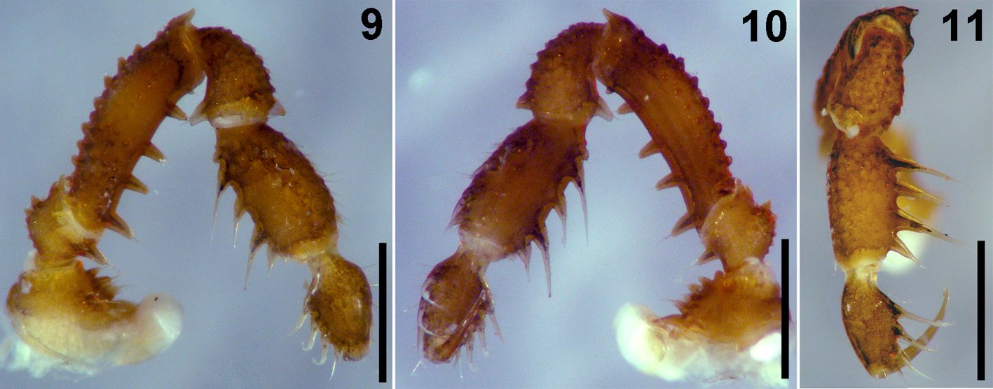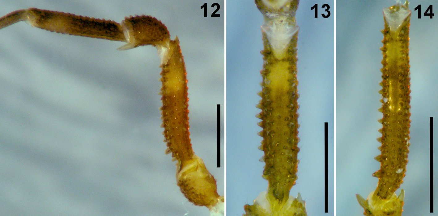 Femur compressed laterally, slightly curved to the inner side, mesal face smooth. Pedipalpal femur with a row of 5 long spiniform setiferous tubercles ventrally, the distal-most is smaller; dorsally with many spiniform tubercles and apical spiniform apophysis. Patella slightly globose, dorsally granulated and with a ventro-apical and a dorso-lateral spiniform apophyses. Tibia with IiIi (1 = 3 > 2 = 4), and tarsus with IIII (1 > 2 > 3 > 4) setiferous spiniform tubercles on both margins, respectively. Tarsal claw similar in length to tarsus (Figs. 9-11). Legs: legs I and II thin and slender; legs III and IV legs more robust than anterior ones, ornated with many spiniform tubercles, these tubercles forming 2 rows longitudinal rows. Trochanters III and IV with a dorsal and a ventral apophyses; patellae III and IV with a ventro-apical spiniform apophyses. With no tarsal process and no scopulae. Tarsal count: 6(2):12(3):7:7 (Figs. 12-14). Penis: pars distalis occupying almost the half length of total truncus, slightly compressed laterally, cylindrical in transversal view. Flimsy lamina cradle-shaped, short and contiguous with the rest of pars distalis; dorsal portion smooth, contrasting with the rest of the truncus. Follis in an inner depression, with dorsal rounded lobe, which fits on dorsal part of pars distalis. Stylus inserted on the follis, barely exposed. Three pairs of MS C ventro-apically, level to the base of flimsy lamina. Two pairs of MS A and B, both on the middle of pars distalis, 1 setae on lateral side and the other ventrally displaced. Two pairs of small MS D laterally to follis (Figs. 15-19).