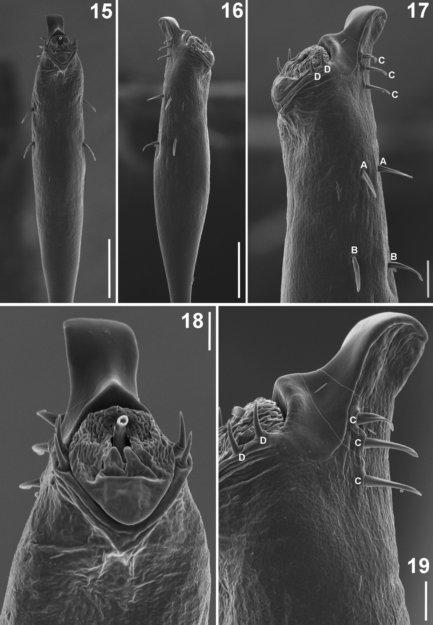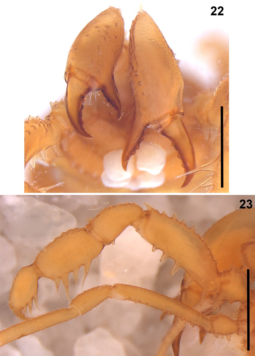 Redescription (female). Scutum length 3.8 mm. Scutum zeta type ((ζ)), mid-bulge smooth, posterior margin much wider than scutum width at level of mid-bulge. Ocularium at the frontal margin of scutum, robust, with the base elliptical and apically armed with a contiguous large spine. Dorsum with many small tubercles. Sulcus I and II slightly curved, areas III and IV barely fused. Area III with a pair of small paramedian acute spines, pointing backward. Free tergites and anal plate covered by a transversal row of spiniform tubercles (Figs. 20, 21). Venter: all ventral area covered by small tubercles, coxae IV slightly larger than coxae III, stigmatic area inverse T-shaped. Chelicera: basichelicerite short, bulla well marked and ornate with spiniform tubercles. Cheliceral hand swollen, dorsally elevated. Frontal section of cheliceral hand with many long setae. Fixed finger with 5 small teeth, movable finger with 5 teeth (Fig. 22). Pedipalp: trochanter globular, armed with some spiniform setiferous tubercles ventrally and dorsally. Femur compressed laterally, mesal face smooth. Pedipalpal femur with a row of 5 long spiniform setiferous tubercles ventrally, the distal-most smaller; dorsally with many spiniform tubercles and apical spiniform apophysis. Patella with a ventral and a dorsal spiniform tubercles, respectively. Tibia with IiIi (1 = 3 > 2 = 4), and tarsus with IIII (1 > 2 > 3 > 4) setiferous spiniform tubercles on both margins, respectively. Tarsal claw similar in length to tarsus (Figs. 21, 23). Legs: I to IV ornate with small tubercles, without apophysis of spiniform tubercles, tarsal count unknown.