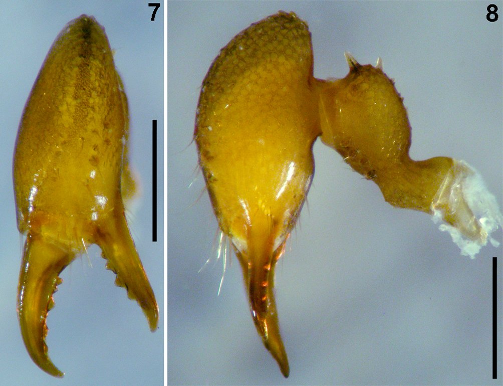 Photographs of the holotypes of I. mexicanus deposited at the British Museum of Natural History (BMNH) and of T. philippii deposited at Senckenberg Museum of Frankfurt (SMF RII 2511/66) were examined. Material of I. neglectus deposited at the Colección Nacional de Arácnidos (CNAN) of the Universidad Nacional Autónoma de México (UNAM) were examined and compared with the photographs of the I. mexicanus holotype. Color images were obtained using a Nikon Coolpix S10 camera attached to a Nikon SMZ645 microscope. Male genitalia were prepared for scanning electronic photographs (SEM) using the procedure described by Acosta et al. (2007). SEM photographs were taken using a Hitachi S-2460N microscope at the Instituto de Biología, UNAM (IB-UNAM) in the Laboratorio Nacional de Biodiversidad (LaNaBio). Photographs were assembled into plates using Photoshop CS5. Nomenclature of scutum follows Kury and Medrano (2016), pedipalpal armature follows Acosta et al. (2007), ratio of the scutum length divided by the cheliceral hand length follows Cruz-López and Francke (2013), and male genitalia follows Kury and Villareal (2015), and Cruz-López and Francke (2017). Abbreviations: MS = macrosetae, RSC = ratio of the scutum length divided by cheliceral hand length.