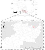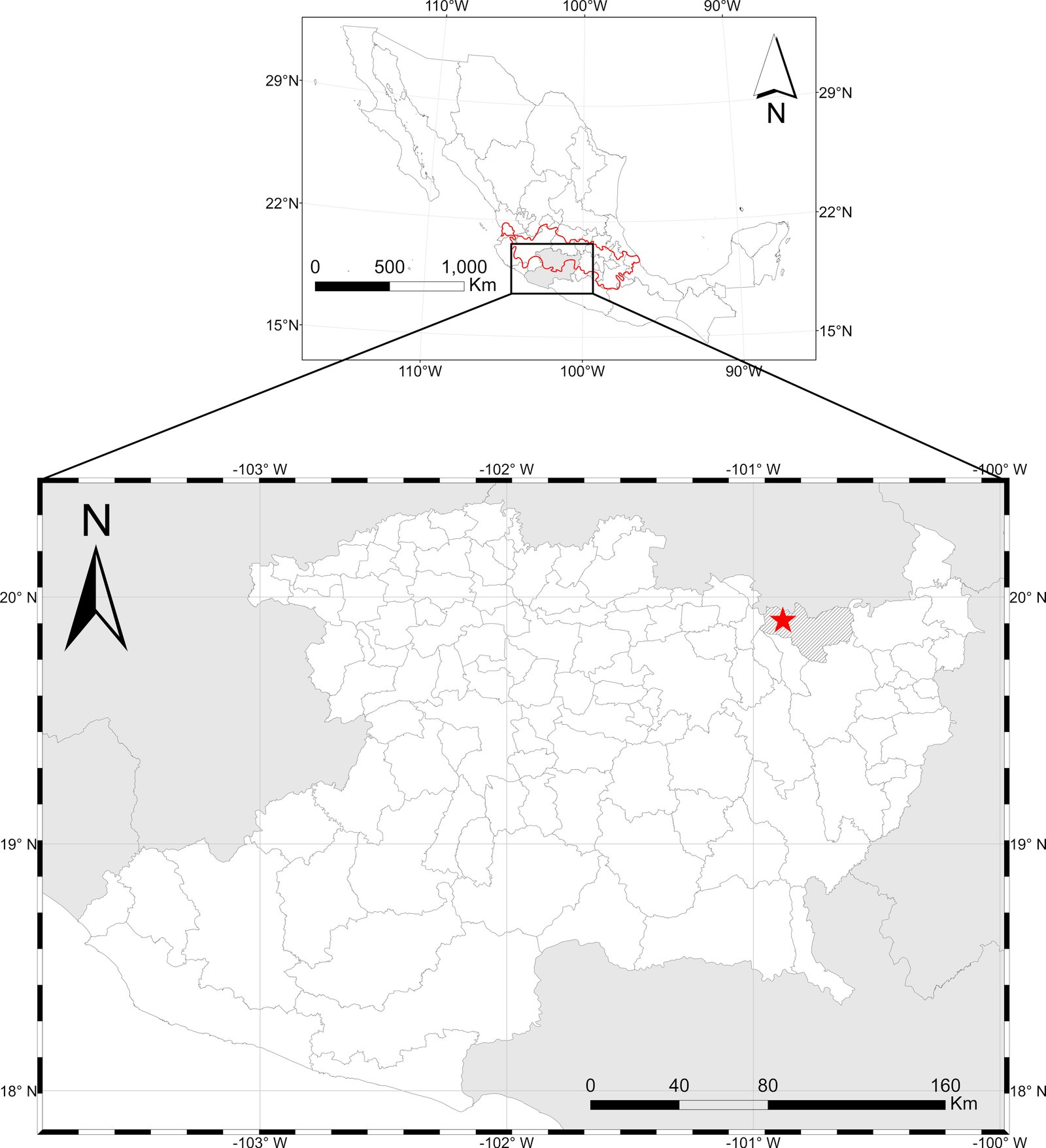 A map that shows the location of the Araró, Michoacán, México (red star). The Araró hot springs are located within the Trans-Mexican Volcanic Belt, approximately 20 km west from the well-known Los Azufres geothermal field.