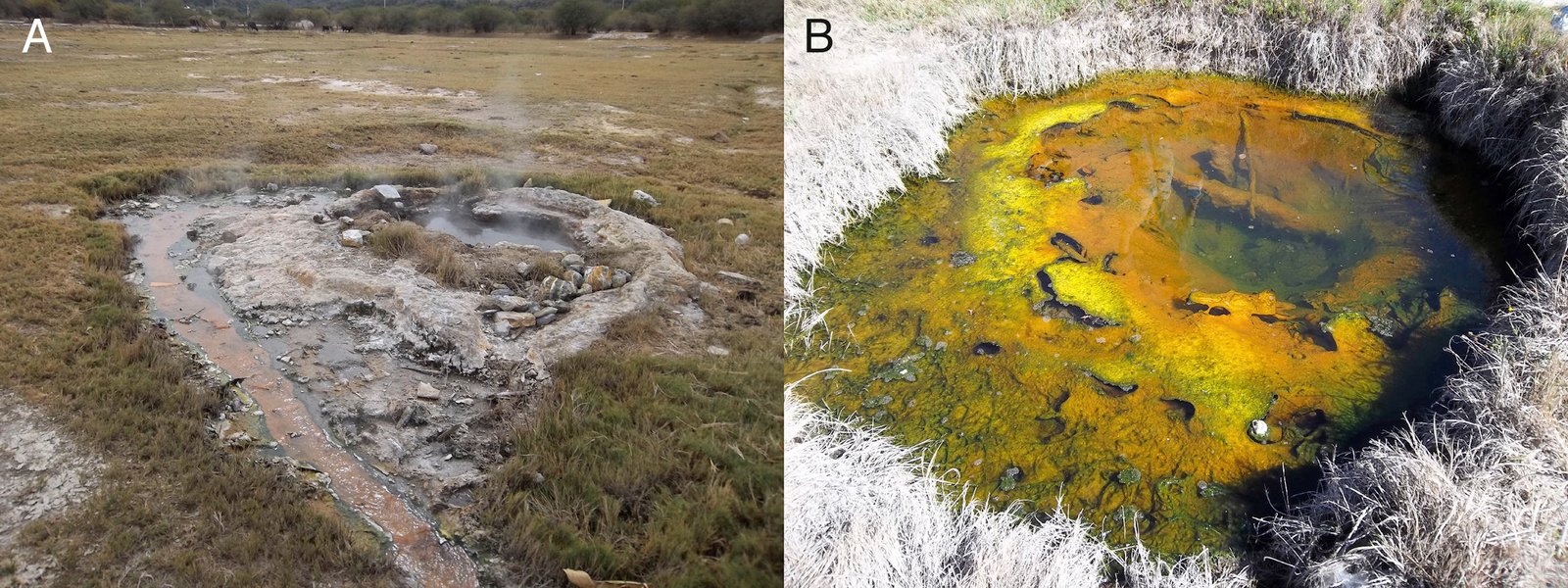 A view of the 2 hot springs from Araró. On the left (A) is the so called Tina hot spring, with constant emission of water. Panel B shows a view of the Bonita hot spring, a “closed system” with low emission of water.