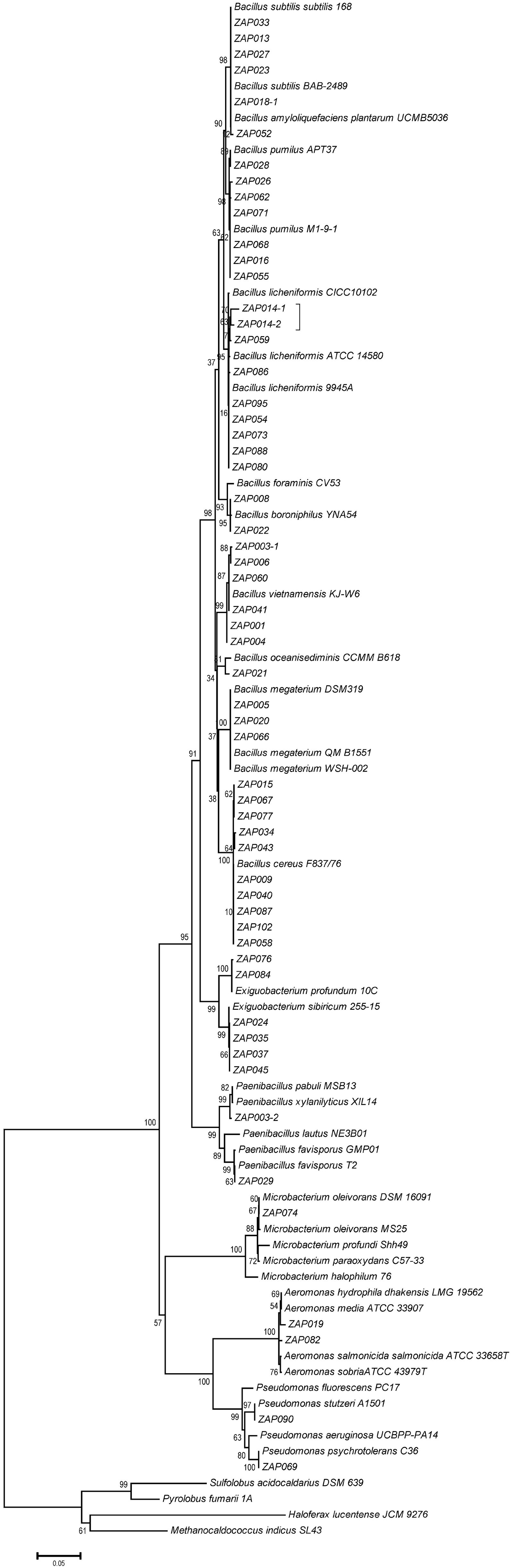 From randomly picked colonies subjected to RAPD analysis, 79 phylotypes (out of 109 bacterial isolates) were detected and subjected to 16S rDNA sequencing. Bacteria from 3 phyla were identified, including species from the genera Paenibacillus, Exiguobacterium, and Bacillus (76%) from the phylum Firmicutes, Aeromonas and Pseudomonas (18%) from the phylum Proteobacteria, and only Microbacterium (6%) from the phylum Actinobacteria. In total, 17 culturable bacterial species were detected in both hot springs. Figure 3 shows the phylogenetic relationships of the bacterial species. Fifty-seven 16S rDNA sequences, including the 17 representative bacterial species shared between both hot springs, were selected for the phylogenetic reconstruction based on length. All of the 16S rDNA sequences displayed close relationships with known bacterial species, particularly with representatives of the Bacillus genus. The clades were not associated with either of the hot springs or any other parameter measured.