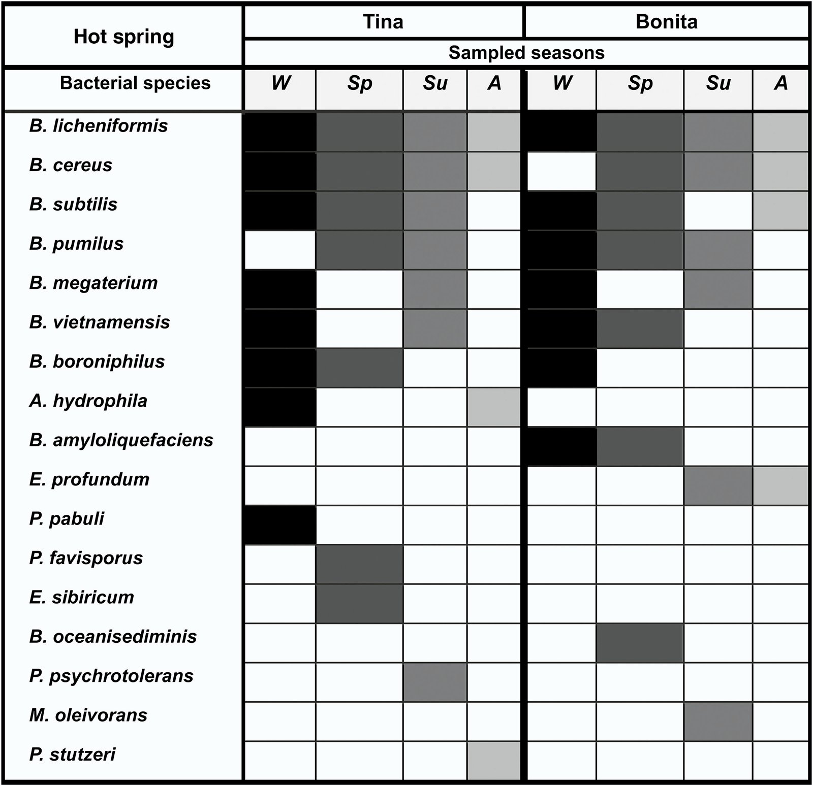 In order to detect the abundance of culturable bacterial cells, the number of CFUs per gram of microbial mat was determined from each hot spring. In general, the number of CFUs was relatively low and fluctuated slightly across seasons. However, it was interesting to note that Bonita showed a 10-fold higher CFU count than the Tina hot spring (1 × 102 CFU/g and 1 × 103 CFU/g, respectively), regardless of the season.