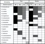 Occurrence of bacterial species isolated during the 4 seasons ( Wi, winter; Sp, spring; Su, summer; Au , Autumn) of the year in the hot spring microbial mats from Araró, México. Bacterial species were classified as dominant (isolated in at least 3 out of 4 sampling seasons), frequent (isolated in 2 sampling seasons) and occasional (isolated only in one sampling season).