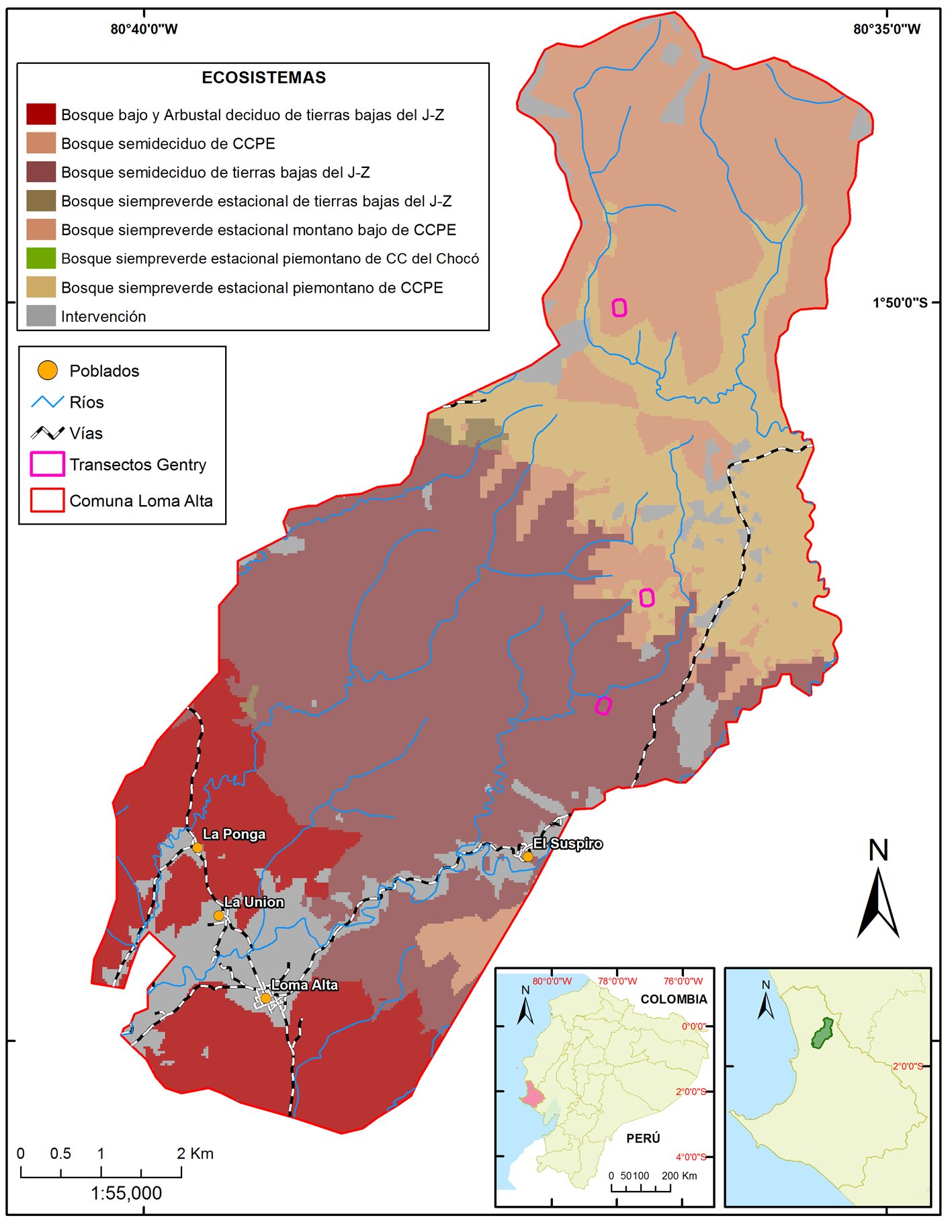 El trabajo de campo se realizó en el año 2015 en la comuna Loma Alta (01º52’ S, 80º 38’ O) ubicada en la provincia de Santa Elena, la cual posee una extensión de 6,842 ha, de las cuales 3,218.19 ha están como Bosque Protector creado en 1987 (Astudillo et al., 2015) (fig. 1).