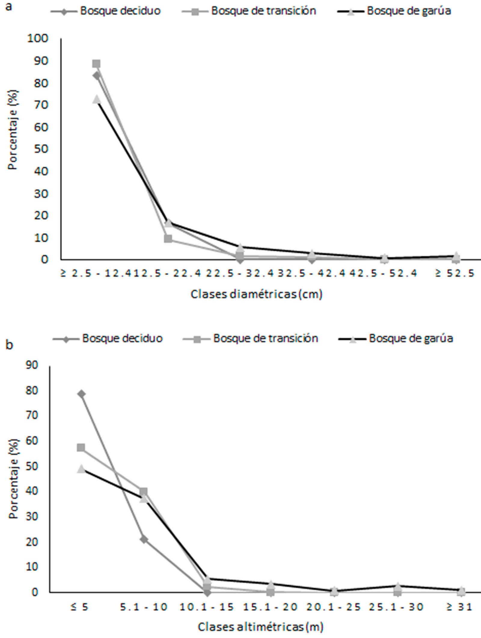 La estructura vegetal se definió mediante parámetros dasométricos y volumétricos, y con estos datos, se obtuvo el índice de valor de importancia (IVI) que resalta la relevancia ecológica relativa de las especies en las comunidades vegetales acorde al carácter y la estructura de un ecosistema (Cottam y Curtis, 1956; Curtis, 1959; Soler et al., 2012), las clases diamétricas y altimétricas abarcaron una escala de 10 cm y 5 m, respectivamente.