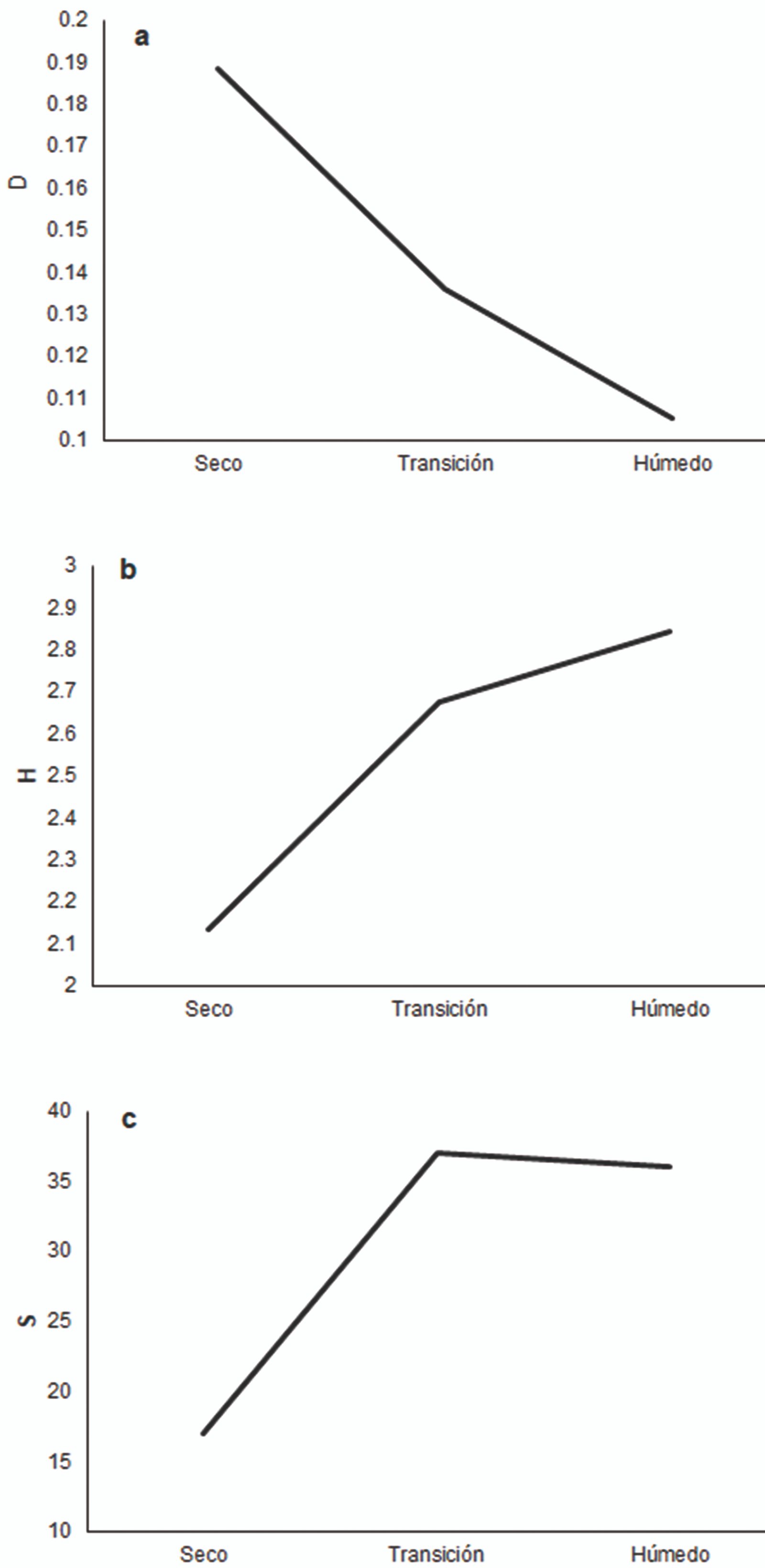 La diversidad alfa (α) se estimó desde el componente de heterogeneidad mediante el índice de Shannon-Wienner (H’), el cual se representó en unidades nats por individuo (nats/ind) y desde el componente de dominancia dado por el índice de Simpson (D) según lo sugiere Moreno (2001) (tabla 1). También, se emplearon estimadores no paramétricos para conocer la riqueza en los 3 tipos de bosques. Estos estimadores consideran las especies pocos abundantes o raras (Colwell y Coddington, 1994), por su enfoque en la extrapolación del número de especies faltantes para conocer si el muestreo realizado fue suficiente (Poulin, 1998). Moreno (2001) sugiere Chao 2 por ser un estimador menos sesgado para muestras pequeñas y como medidas complementarias de los análisis de diversidad. Se estimó también la diversidad β desde la propiedad de reemplazo en cada tipo de bosque mediante el índice de Whittaker, que ha sido el más utilizado para diferentes trabajos (Koleff et al., 2003; Magurran, 1988; Wilson y Shmida, 1984) y por ser el más robusto; su fórmula es: