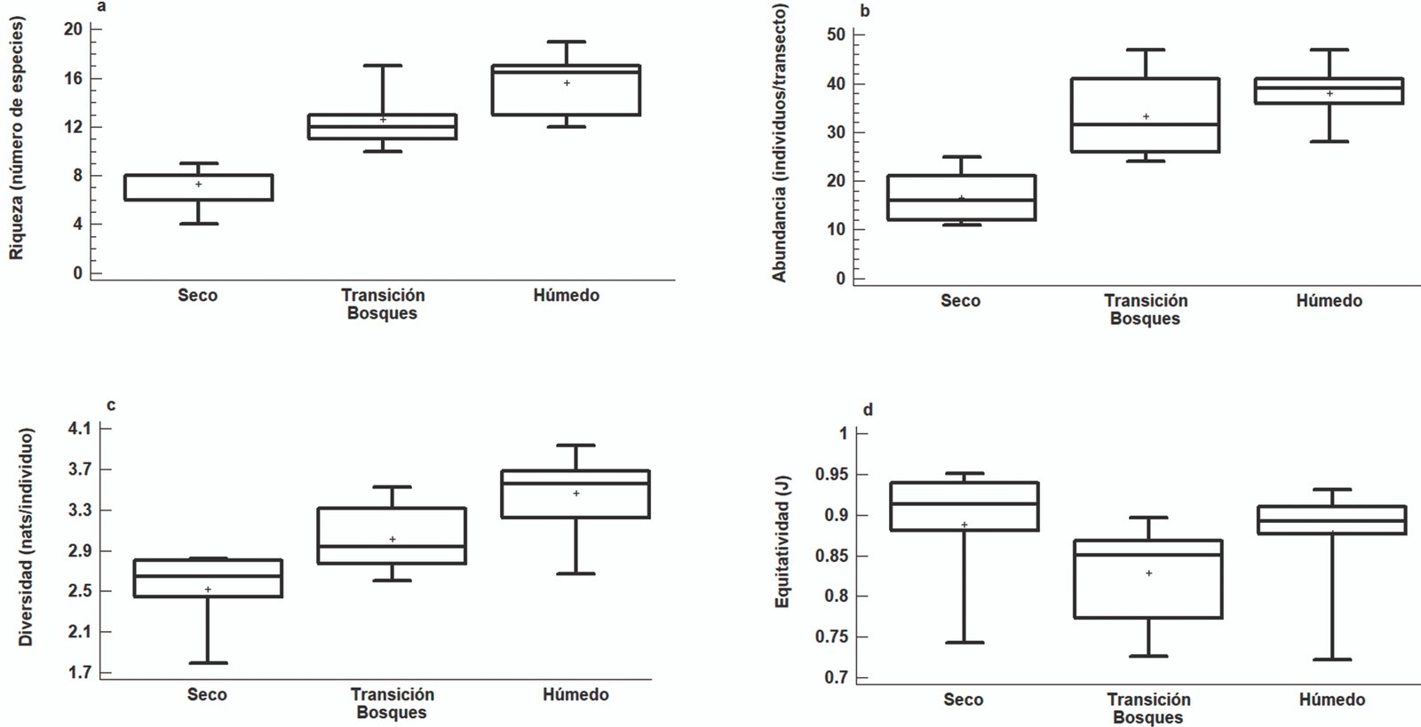 Siguiendo los patrones elevacionales, se planteó la hipótesis de que la riqueza se incrementa positivamente con la altitud. Para ponerlo a prueba, se determinaron posibles diferencias en la estructura comunitaria vegetal tales como la riqueza, abundancia, equitatividad y diversidad entre bosques utilizando un análisis de varianza no paramétrico de Kuskal-Wallis (KW) al comprobar el no cumplimiento de los supuestos de normalidad (Kolmogorov Smirnov) y homocedasticidad (Zar, 1996). Los datos fueron expresados en cajas y bigotes acorde con las recomendaciones de Boyer et al. (1997).