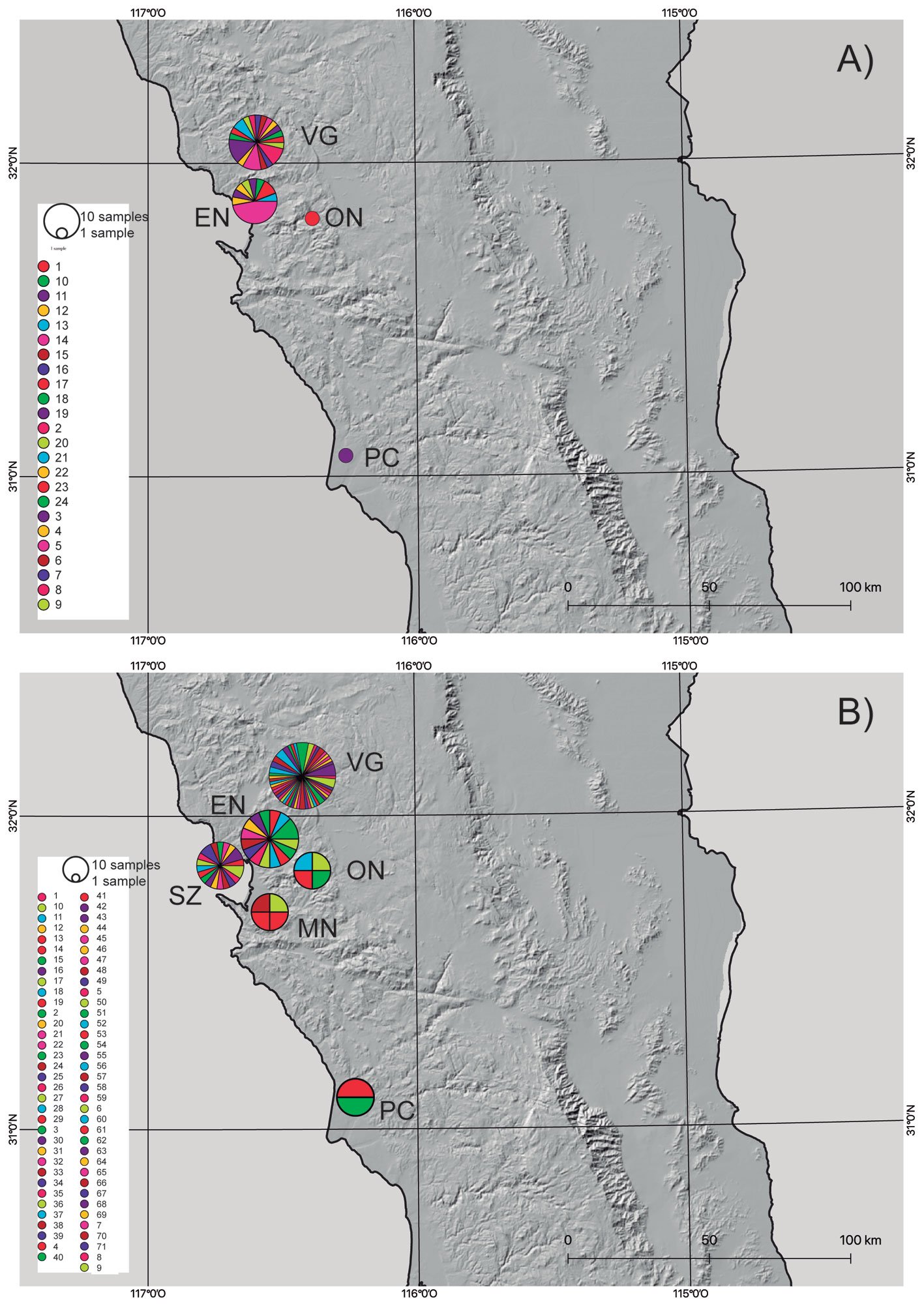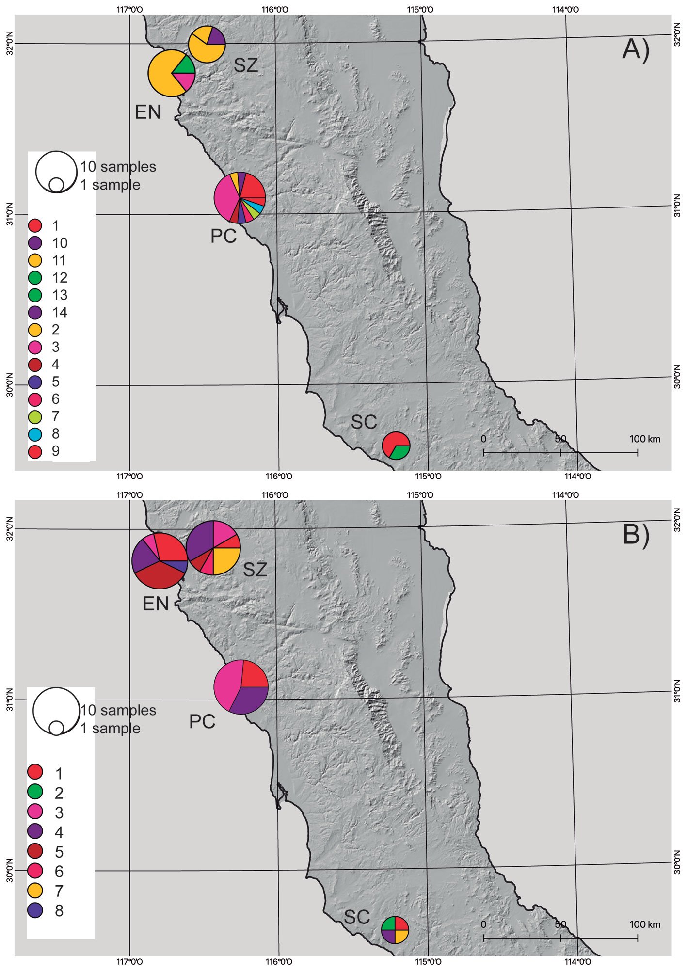 Based on the results from the mcmc runs in structure combining the mitochondrial and nuclear markers, P. johnsoni and P. phoenix comprise 2 populations each (Table 1; Supplementary material: Figs. S1, S2). The haplotype networks of P. johnsoni (Fig. 3) lack structure and generally show between 1 and 3 mutations from one haplotype to the other. For P. phoenix, more mutations are found between the general Ensenada/El Sauzal population than the rest, but only visible in the mitochondrial haplotype network (Fig. 4). Comparing the outcomes of the structure runs to the haplotype networks and the geographical congruence (Figs. 5, 6), the 2 hypothetical populations of P. johnsoni will be considered as one (note: structure does not allow for one single population as an output), and P. phoenix as 2 populations: a “northern” population which includes the localities in and around Ensenada and a “southern” population with individuals from Punta Colonet and Santa Catarina.