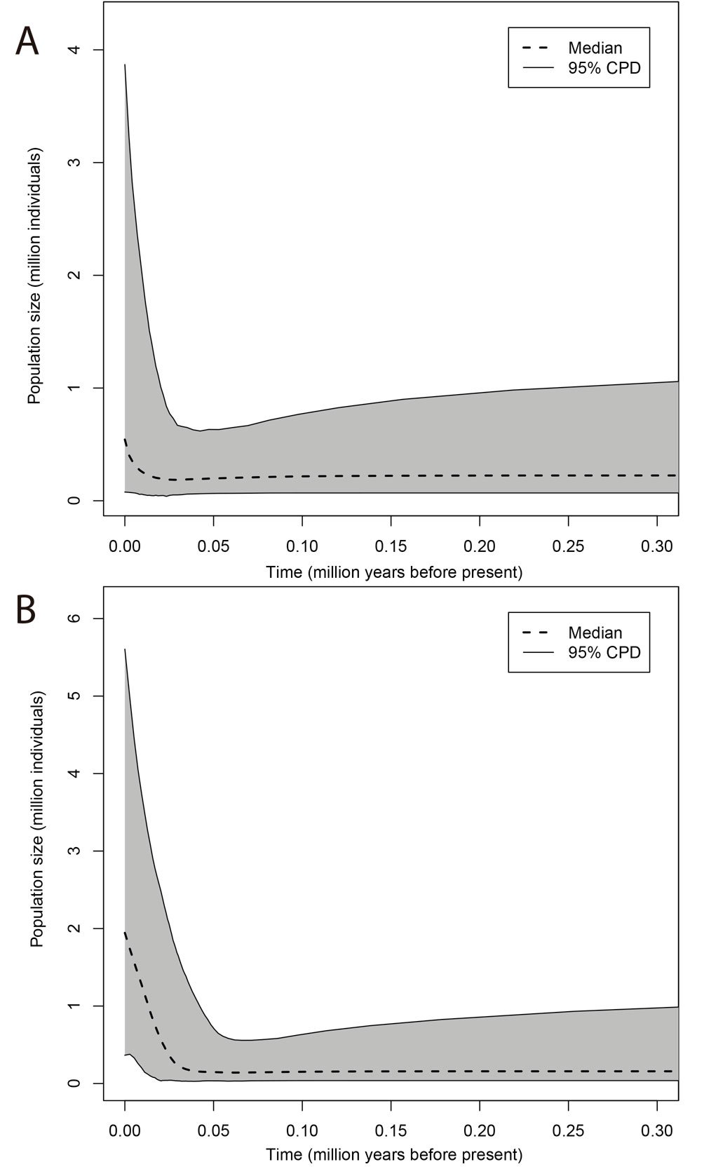 Based on the EBSP plots of the single P. johnsoni population and the 2 P. phoenix populations from this study (Figs. 7, 8), the estimated current population sizes (assuming a generation time of 1 year) are 1.5 million for P. johnsoni, ca. 500,000 for P. phoenix’ northern- and 2 million for P. phoenix’ southern population. All 3 populations are shown to have increased in size, with the population size increase starting around 150,000 years ago (kya) for P. johnsoni, 20 kya for P. phoenix’ northern and 30 kya for P. phoenix’ southern population.
