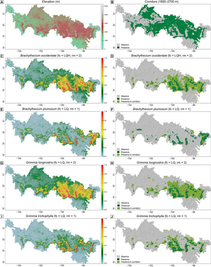 The predictive mapping shows that all modeled species are expected to occur in alpine and adjacent highland areas of the Neovolcanic Belt, as well as in corridors, although to varying extents (Fig. 2). These distribution patterns are clearly visible in our binary predictions (Fig. 2D, F, H, J), where dark and light green colors correspond to the predicted presence of the species outside and within corridors, respectively. Specifically, B. occidentale, G. longirostris, and, to a lesser extent, G. trichophylla are expected to occur in corridors acrosscentral and eastern sites of the Neovolcanic Belt, while B. plumosum only is restricted to corridors in the easternmost portion of this region. Brachythecium and a few other pleurocarpous mosses in the alpine areas of central Mexico form mats and tufts (Table 1). Tufts or cushions seem to characterize most acrocarpous mosses including several species of Grimmia at these high elevations that seem to have a wider distribution there. Maps show the areas of occurrence where herbarium specimens record actual findings; G. longirostris was recently collected in other sites outside the Neovolcanic Belt. Most new findings occur in comparatively lower localities in drier areas.