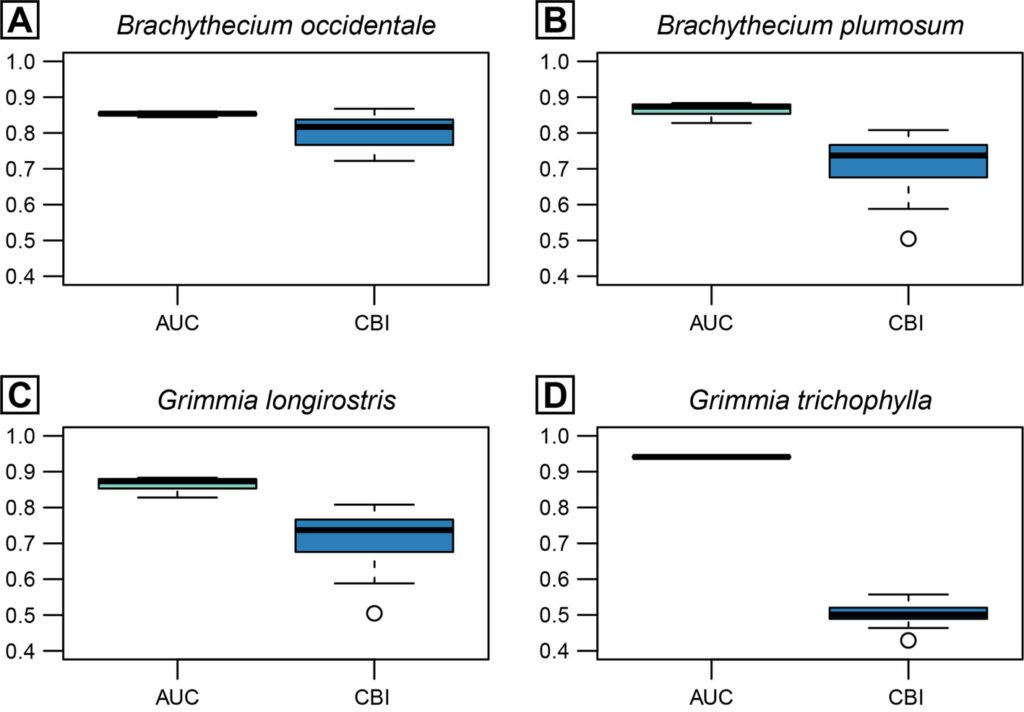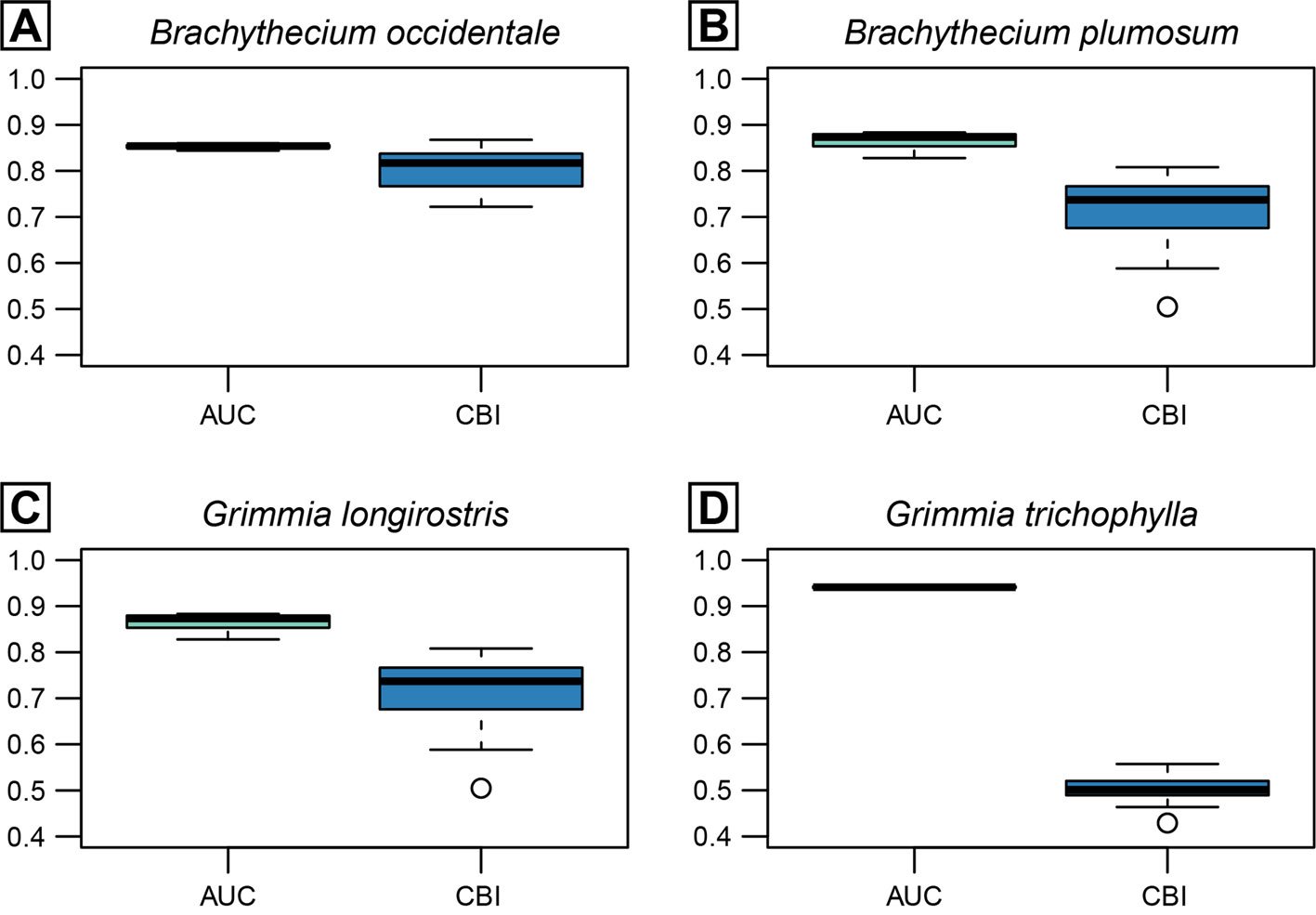 AUC and CBI metrics showed high to relatively high predictive accuracy across all candidate Maxent models evaluated per species resulting from different configurations of feature classes and regularization multipliers (Fig. 1). While B. plumosum, G. longirostris, and G. trichophylla were best predicted using a LQ model, a more complex LQH model performed best for B. occidentale; regularization multipliers varied between 1 and 2 across species (Table 3). The best performing models for each species showed validation AUC and CBI values ranging from 0.83 to 0.94 and from 0.61 to 0.82 (Table 3), indicating, respectively, high predictive accuracy and generally strong agreement between observed and predicted suitability.