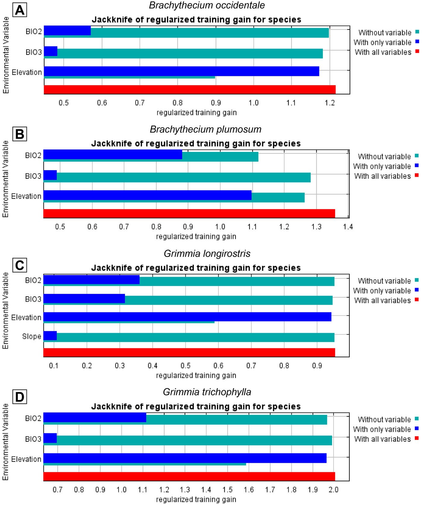 Final models for all 4 species consistently included elevation, which emerged as the most influential predictor of the distribution of B. occidentale, G. longirostris, and G. trichophylla, yielding the highest gain in performance when used in isolation and causing the greatest drop when excluded from the model(Fig. 3). In contrast, B. plumosum was best predicted by BIO2 (Mean Diurnal Range), as evidenced by the greatest decrease in model performance when this predictor was omitted, with elevation playing a secondary but still relevant role. The remaining predictors retained in the final models showed only marginal contributions, including BIO2 and BIO3 (Isothermality) for B. occidentale, and slope and BIO2 for G. longirostris and G. trichophylla, respectively (Fig. 3). Regarding species response curves, elevation exhibited a positive sigmoidal relationship with environmental suitability across the 4 target species, with suitability values increasing with elevation (Supplementary material: Fig. 1). More specifically, all species showed an increase in predicted environmental suitability from intermediate values (0.5) at elevations between 2,000 m and 2,300 m to high suitability values (≥ 0.8) at elevations equal to or exceeding approximately 2,700 m, with their environmental optimum (asymptote) reached at elevations equal to or exceeding 2,600 m for both Brachythecium species and 3,200 m for the Grimmia species (Supplementary material: Fig. 1). On the other hand, BIO2 showed a reversed sigmoidal relationship with environmental suitability for B. plumosum, with suitability values decreasing as BIO2 values increased (Supplementary material: Fig. 1). Specifically, high environmental suitability values (≥ 0.8) were associated with BIO2 values of approximately ≤ 13 °C, with the environmental optimum (asymptote) occurring at BIO2 values ≤ 12.5 °C; environmental suitability for B. plumosum decreased to intermediate values (0.5) at BIO2 values equal to 14.5 °C (Supplementary material: Fig. 1).
